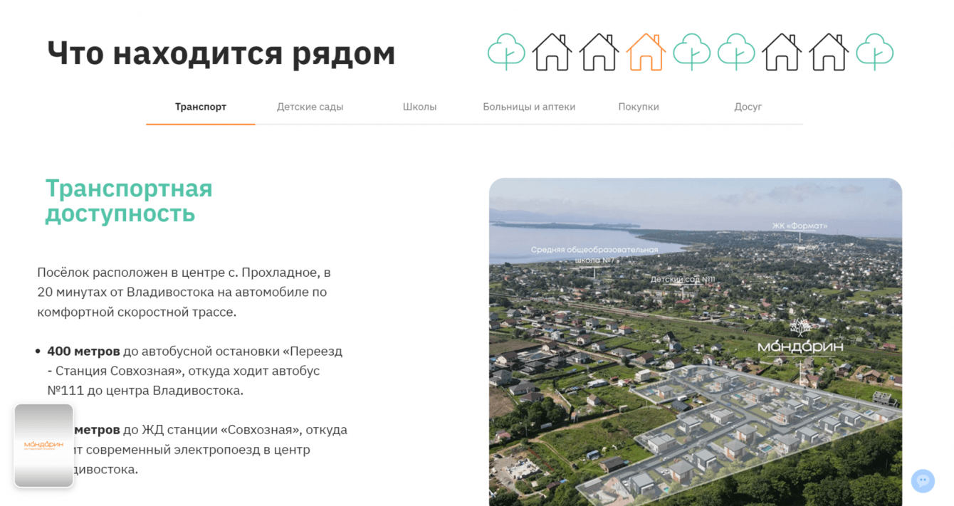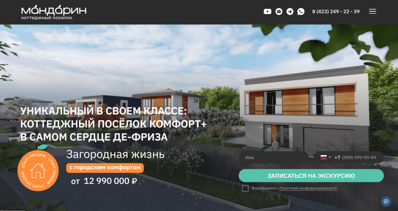 Клиенту потребовался сайт для коттеджного поселка "Мандарин", который привлекал бы потенциальных покупателей и предоставлял полную информацию о поселке, его инфраструктуре и домах.