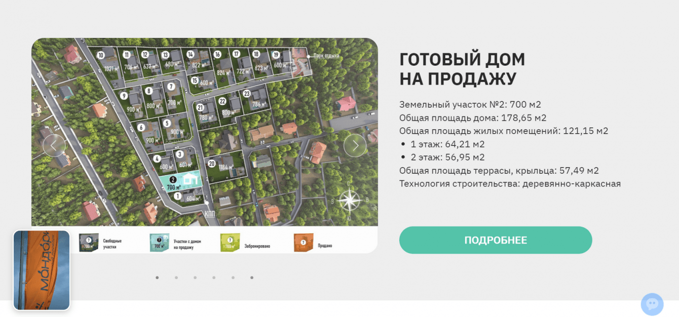 • Генеральный план посёлка с интерактивной картой, где можно узнать подробности о каждом участке.