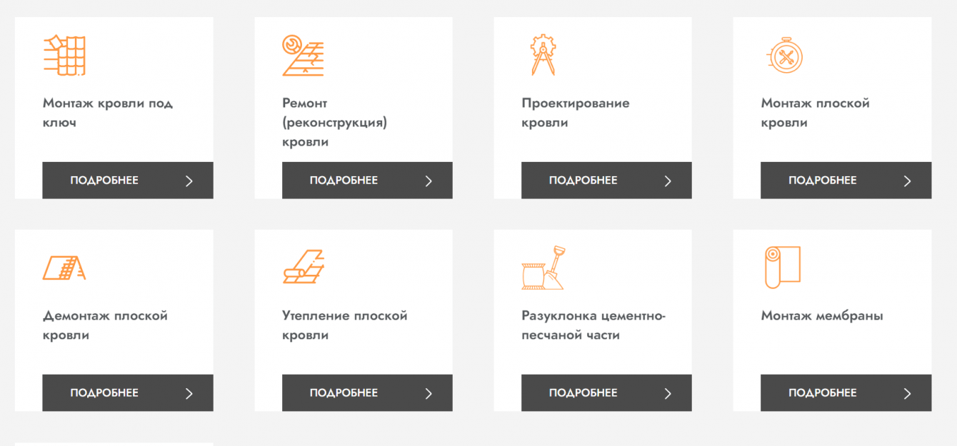 Основным пожеланием клиента по визуалу была разработка стильного дизайна, в темных тонах с анимацией. Для каждого раздела мы создали хэдэр с фото кровли из готовых проектов клиента, что позволило наглядно понять, какую именно услугу оказывает клиент и как ее реализует. В каждой категории реализован навигационный сайдбар с формой обратной связи. Услуги клиента отражены сеткой листинга с переходом на одиночную страницу услуги, где есть возможность задавать кастомные фоновые изображения и размещать сео-текст.