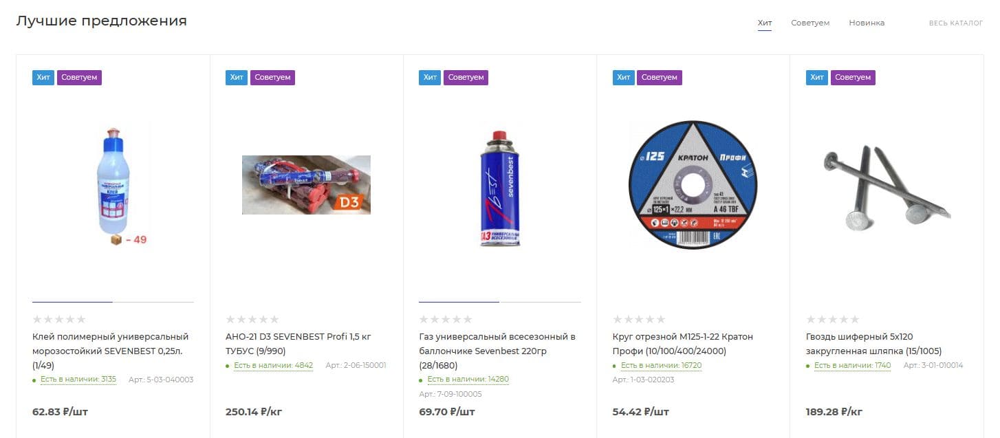 В карточках товаров из категории «Лучшие предложения» мы использовали маркетинговые стикеры «Хит» и «Советуем». Они сразу привлекают внимание к самым заманчивым предложениям!