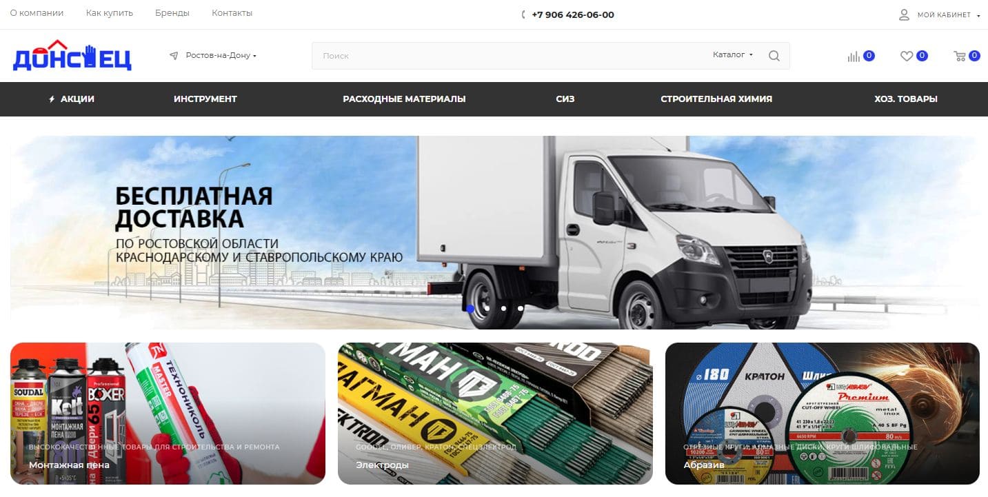 Клиент: Компания «ДонСпец» — настоящий гигант среди поставщиков хозтоваров и стройматериалов в Южном Федеральном округе! У них найдётся всё, что нужно для строительства и ремонта — ассортимент просто огромный, более 2000 наименований! И что самое приятное — большая часть товаров всегда в наличии, так что заказ можно оформить и получить очень быстро. Качество товаров — на высоте, есть все нужные сертификаты. А для постоянных клиентов есть специальная программа скидок — отличный бонус!