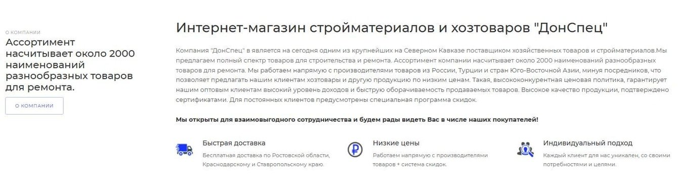 В блоке мы чётко и лаконично рассказали о «ДонСпец», подчеркнув профессионализм и широкий ассортимент товаров. Информация оформлена в корпоративных цветах — это создаёт единое визуальное впечатление.