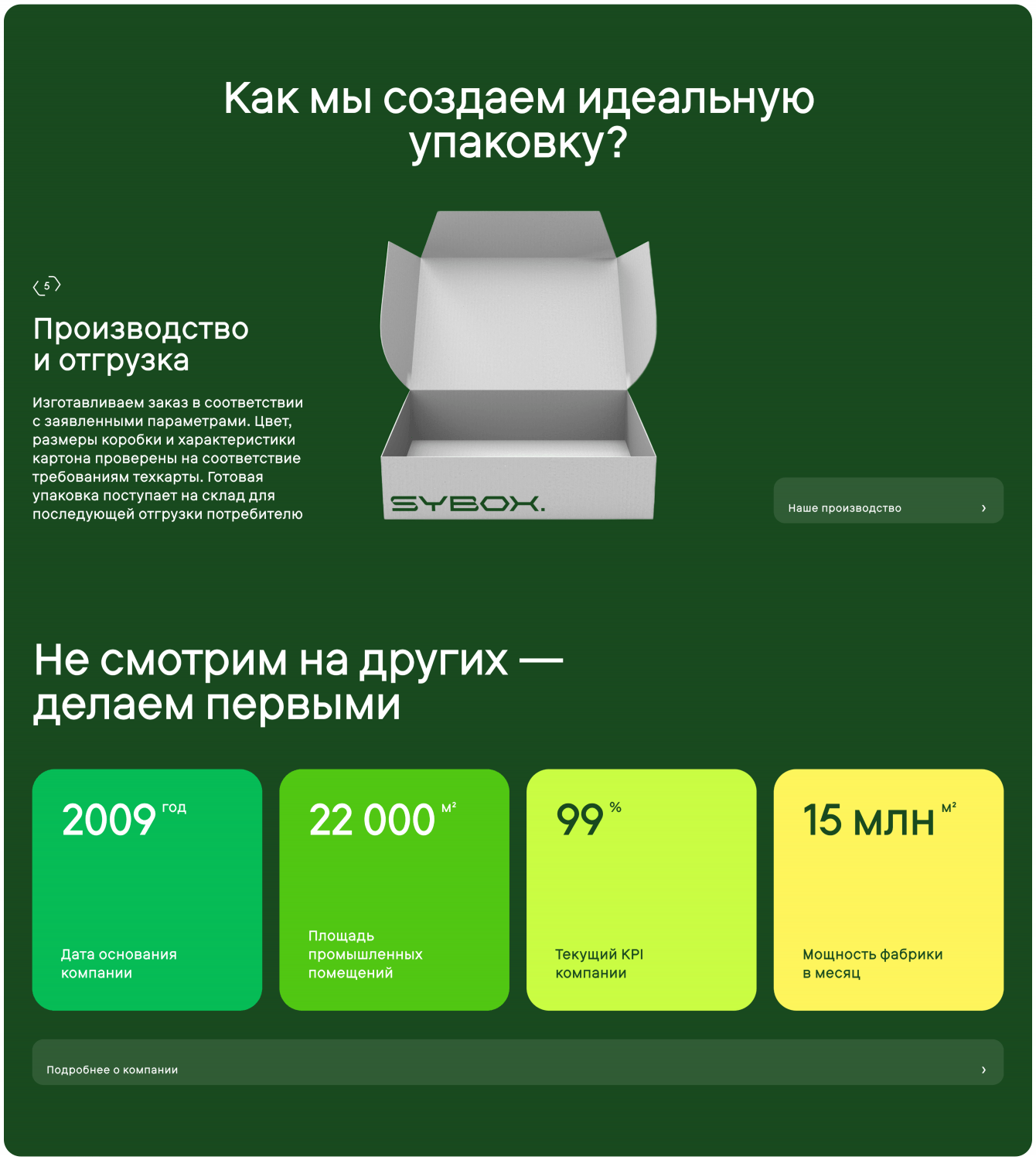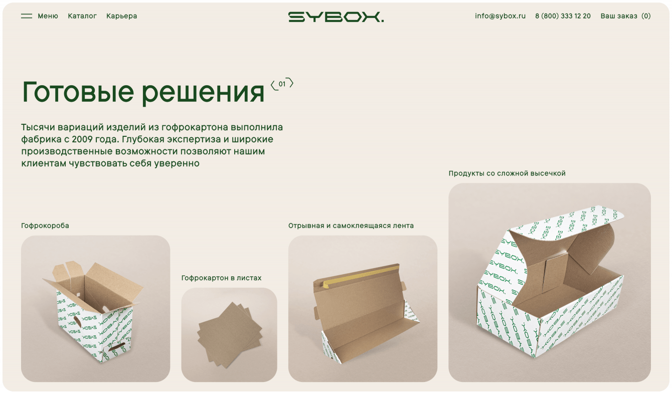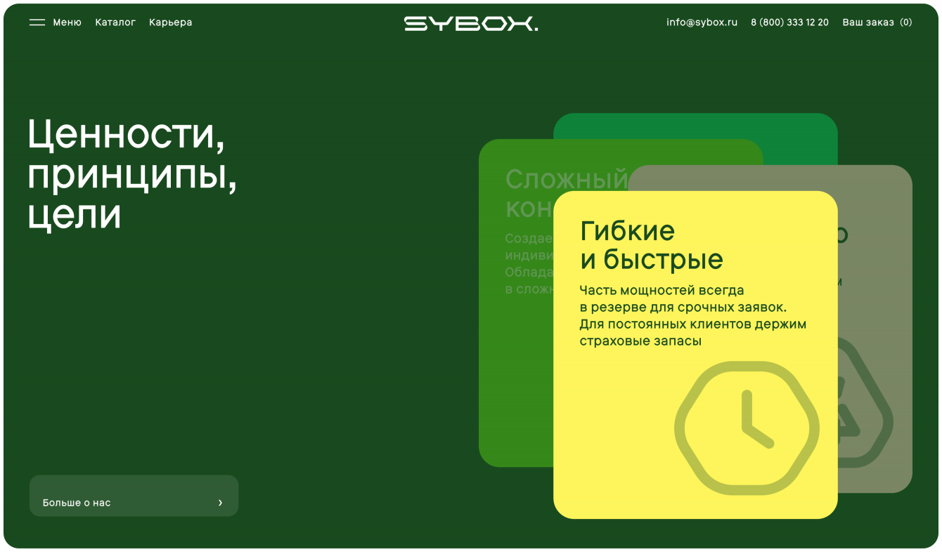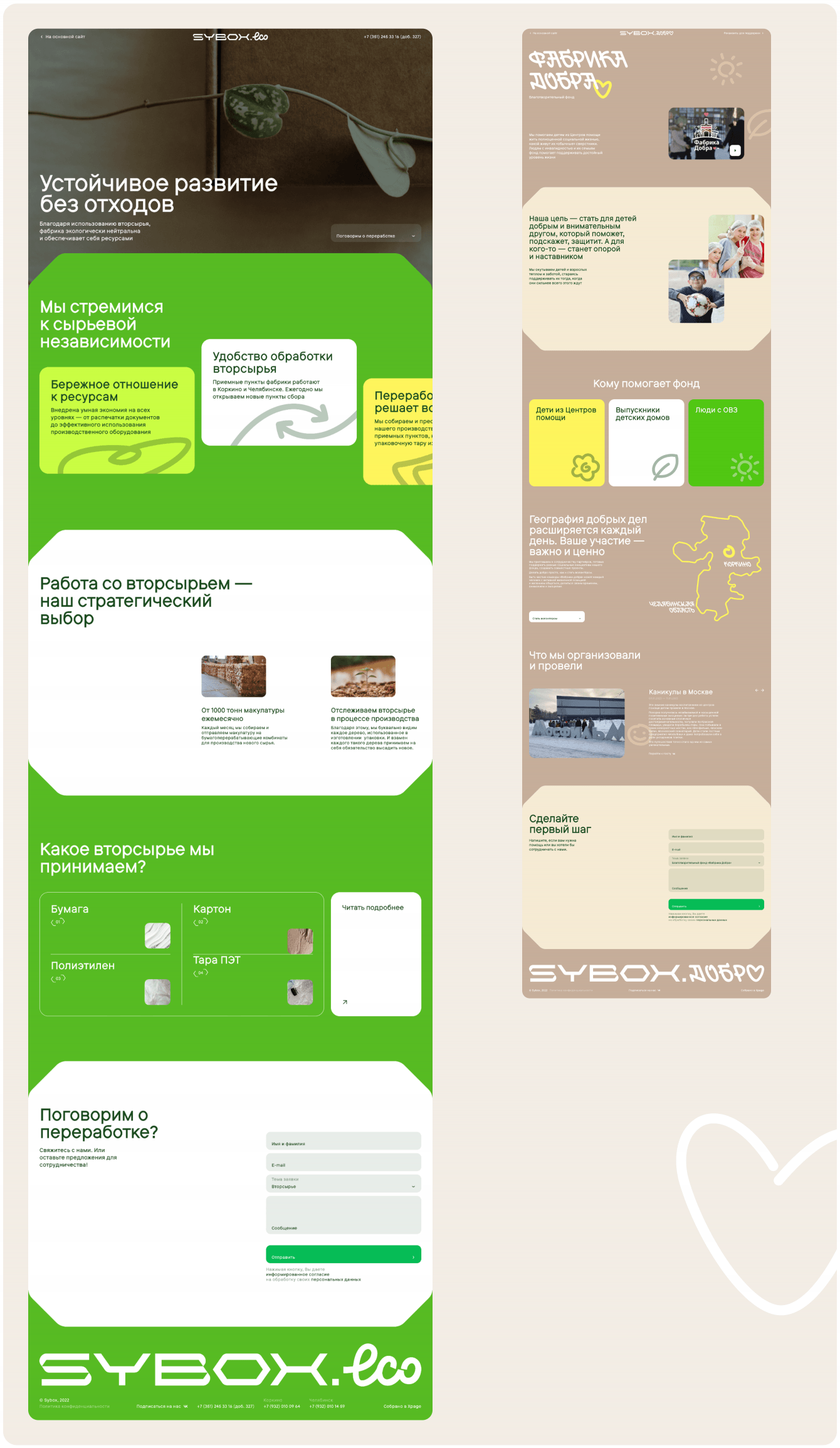 Внутри сайта расположены два лендинга Sybox.eco и Sybox.добро. Концепция Sybox.eco в цветовом оформлении создает ассоциативный ряд с восприятием живой природы, что важно при донесении смыслов о работе со вторсырьем. Sybox.добро по дизайну отличается более теплыми оттенками, тем самым отражает ценности компании в направлении благотворительности, при этом все в рамках фирменного стиля.