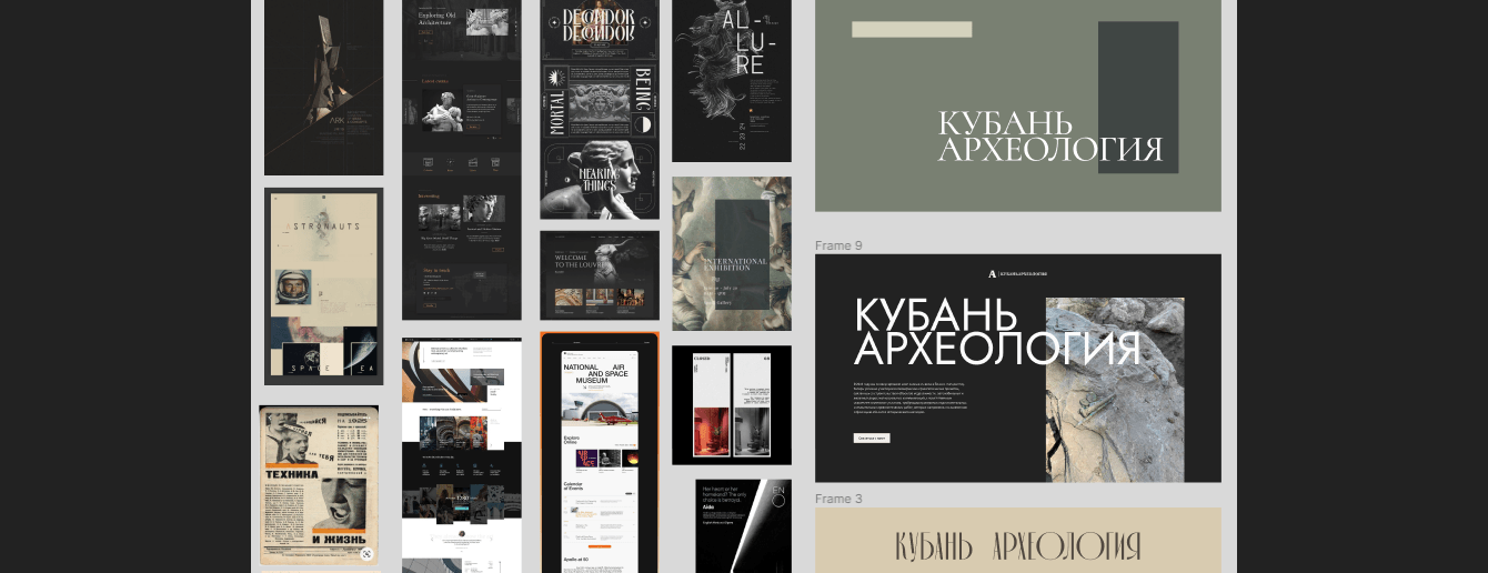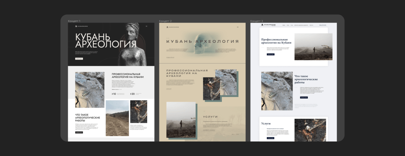 Во всех концепциях дали свободы блокам: большие отступы, чистая типографика, работа с пустым пространством. Данная концепция как раз уже передавала этот завораживающий исторический дух археологии.
