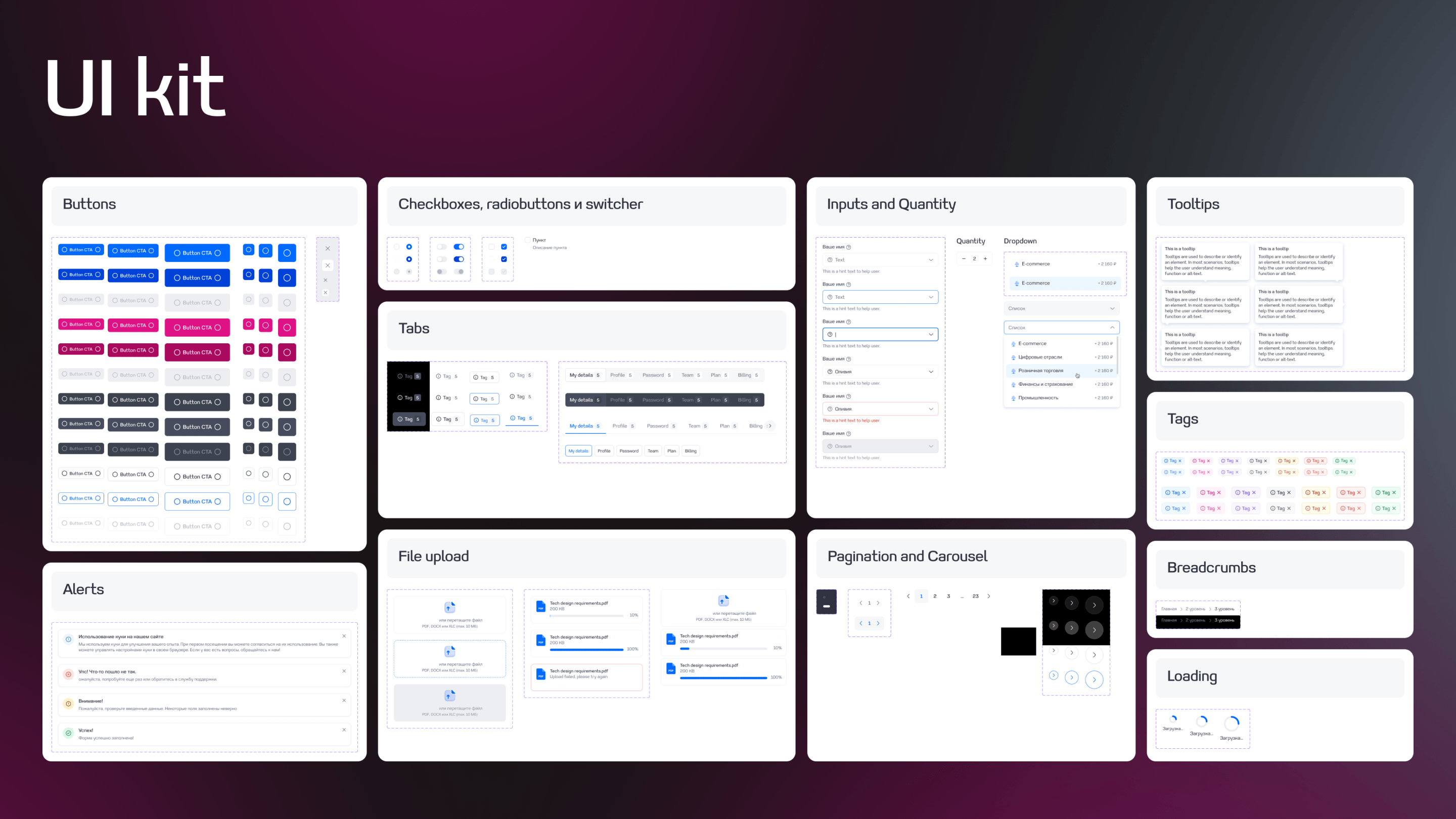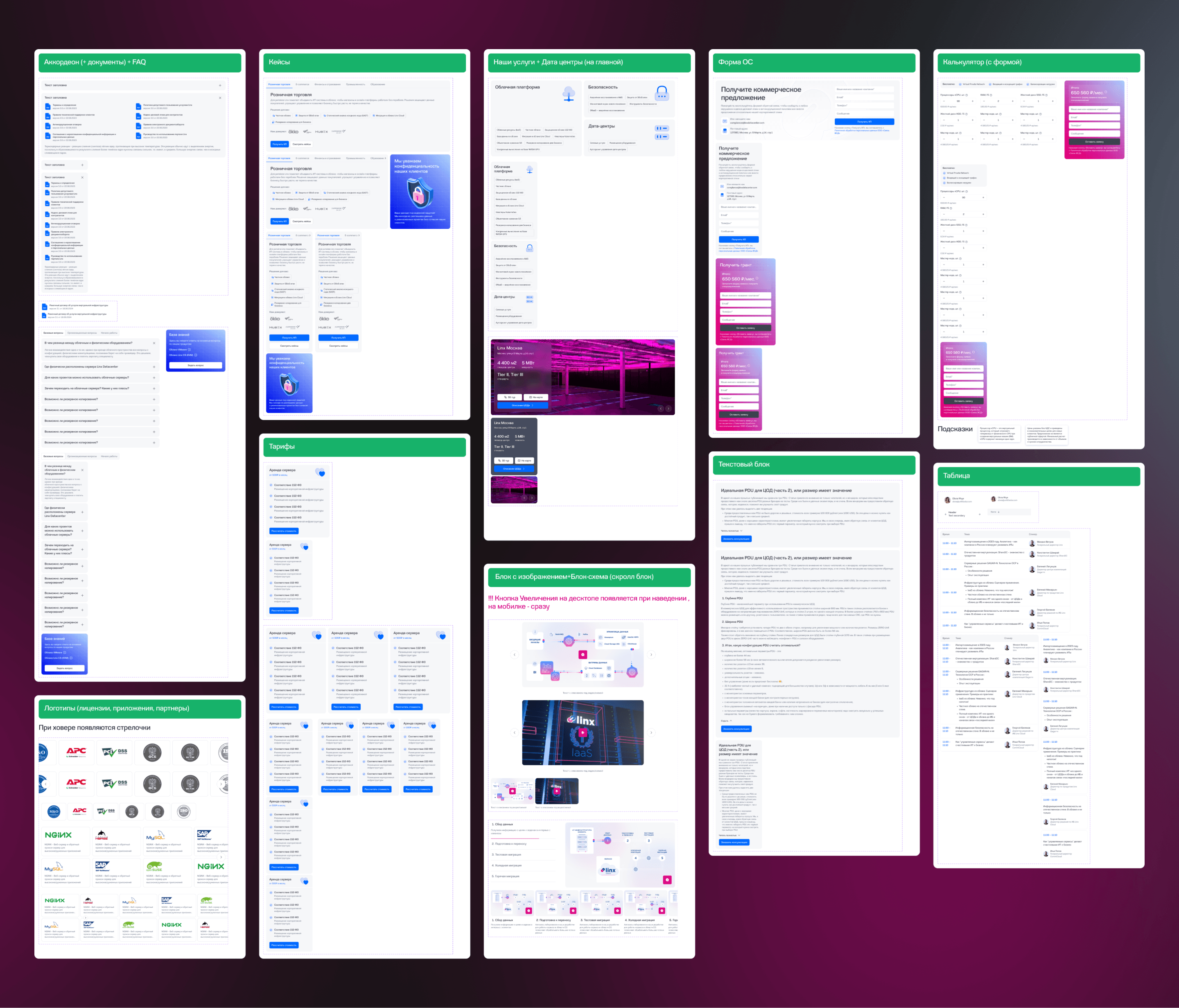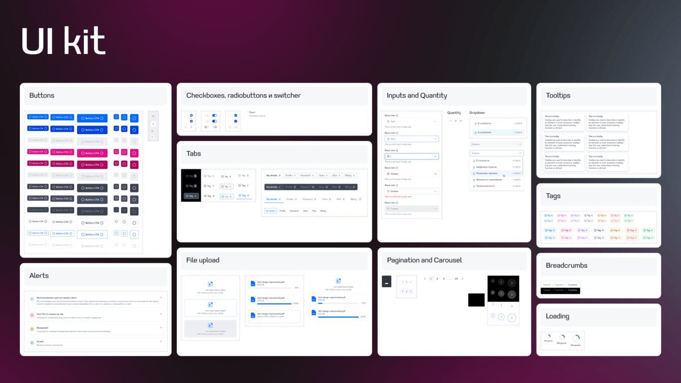 Мы отрисовали все текстовые страницы сайта, содержащие информацию о компании, и множество вариаций блоков для создания продуктовых страниц. Мы также сделали UI-kit, включающий все компоненты конструктора.