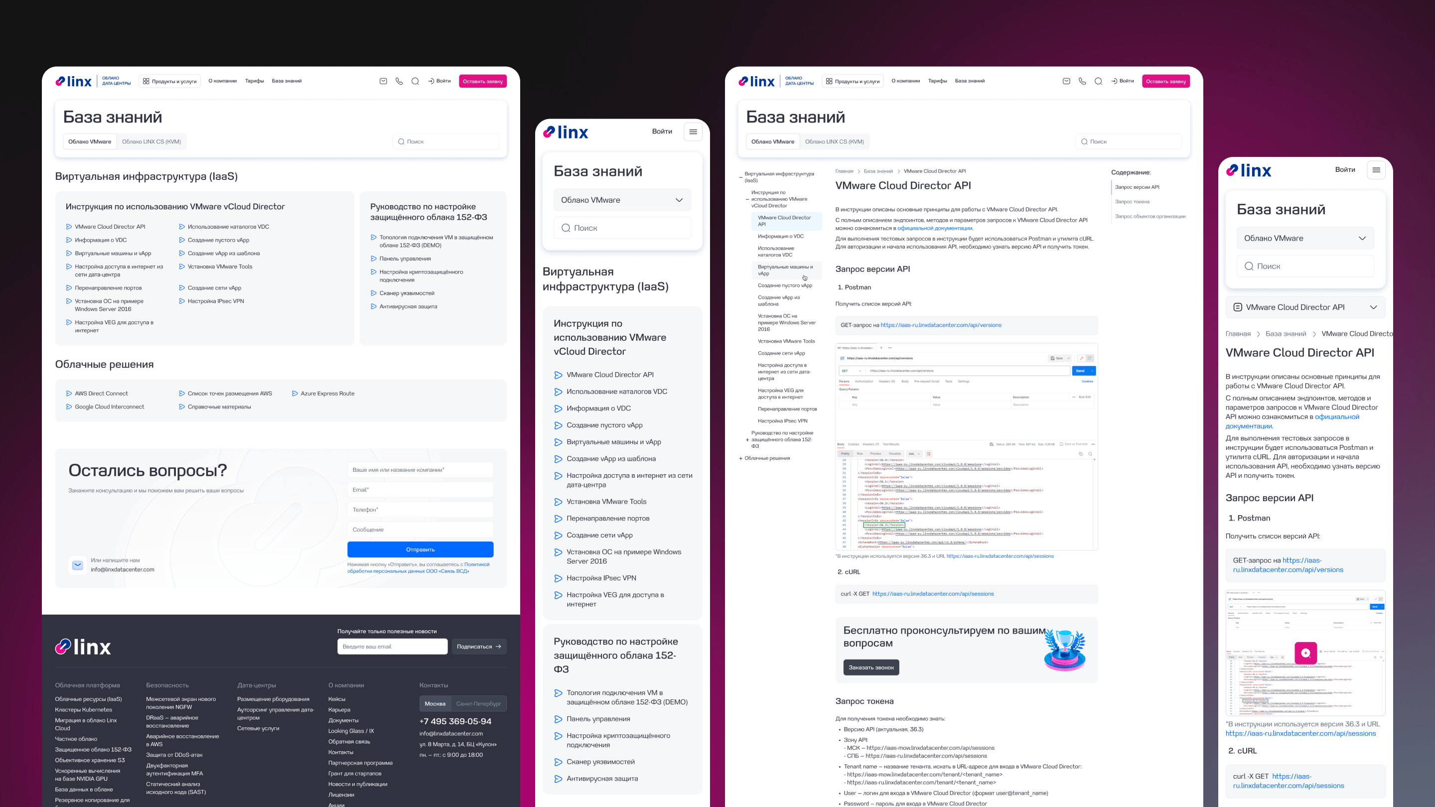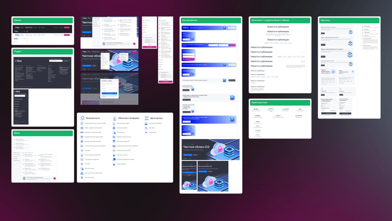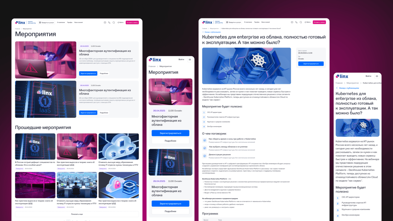 У клиента была потребность в наполнении большого количества страниц продуктов с разной структурой. Мы предложили использовать и кастомизировать встроенный в Битрикс визуальный конструктор «Сайты 24», чтобы команда Linx Cloud могла самостоятельно управлять содержанием и структурой сайта без помощи разработчиков. Это решение используется на другом нашем проекте с множеством продуктовых страниц — сайте Банка Хлынов.