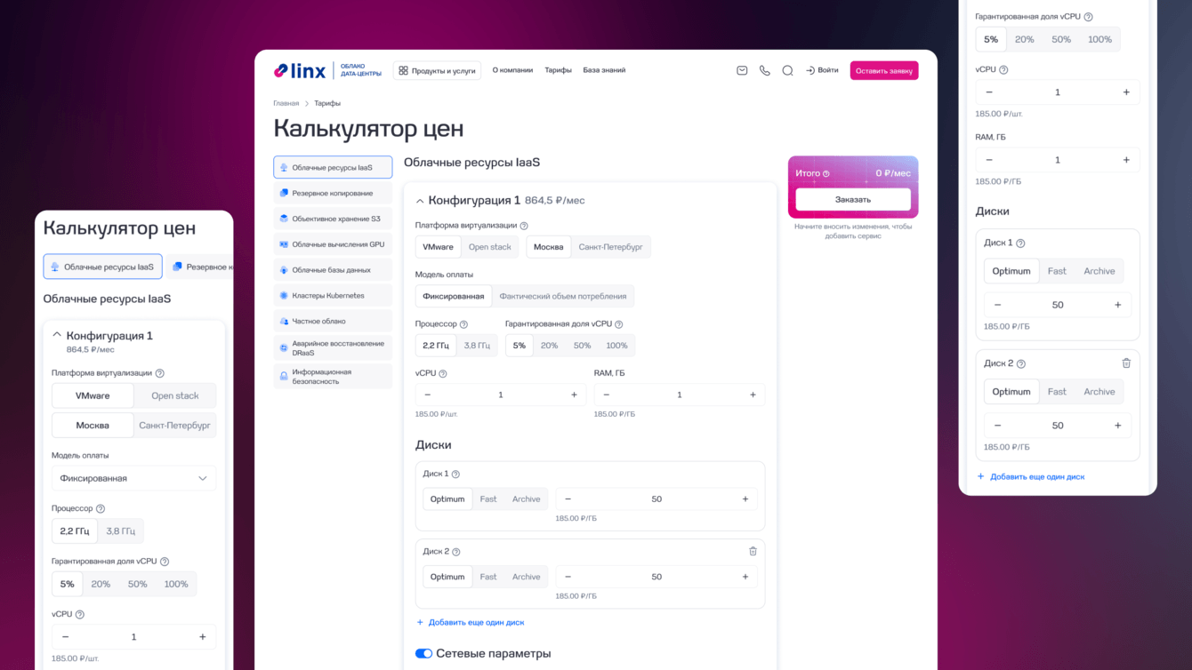 Мы разработали калькулятор с большим количеством параметров, которые взаимосвязаны между собой. Калькулятор позволяет быстро рассчитать стоимость тарифов даже в самых сложных конфигурациях. Меняется один блок — и пересчитывается вся система, тарифы, свойства и стоимость. При этом инструмент выглядит интуитивно и не перегружает пользователя.