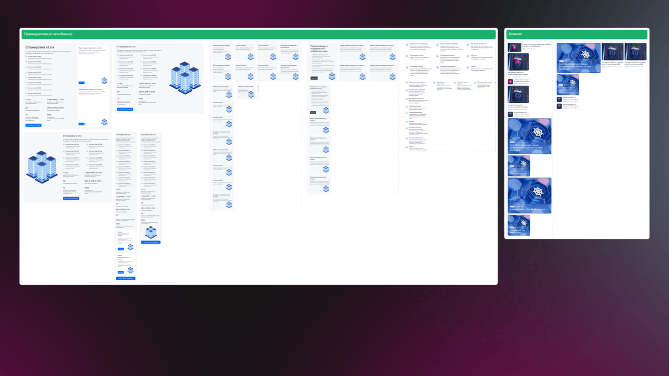На базе «Сайты 24» мы создали свой конструктор и доработали его под визуал клиента, держа в фокусе один из основных запросов — управляемость. Мы создали блоки, позволяющие администратору собирать страницы из типовых элементов с разными вариантами отображения.