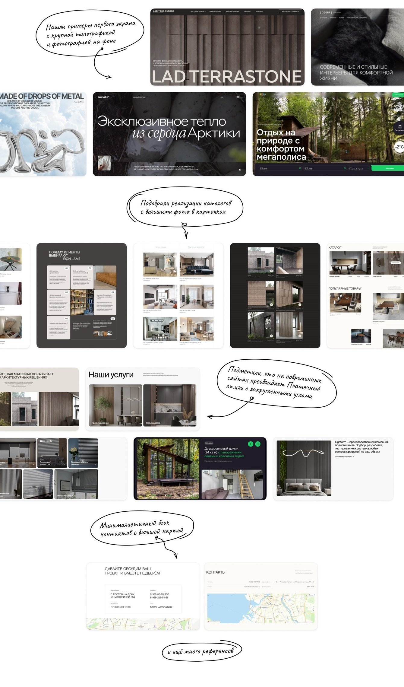 Подобрали референсы в поддержку идеи с крупными фотографиями и минимумом текста.