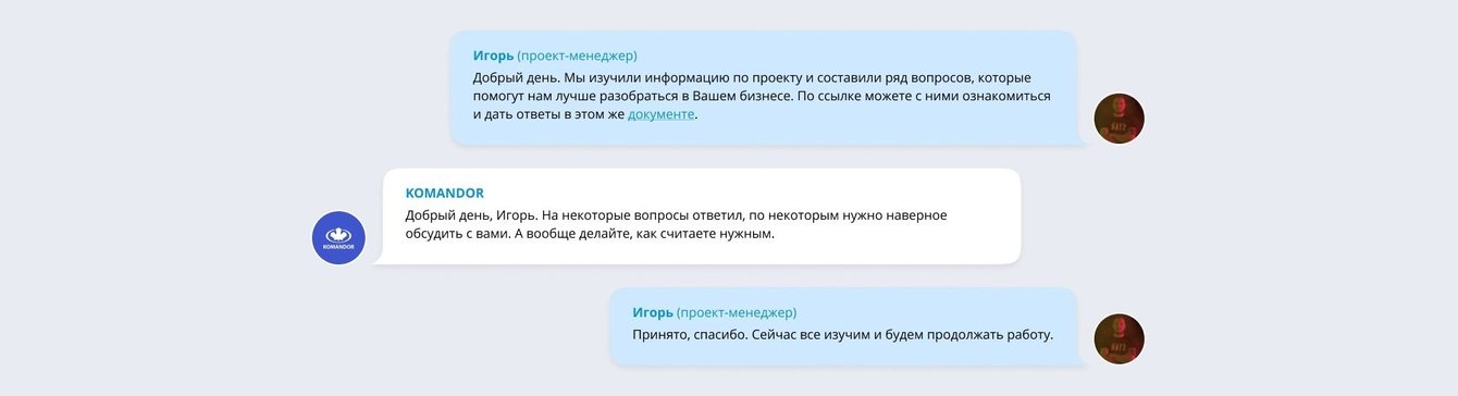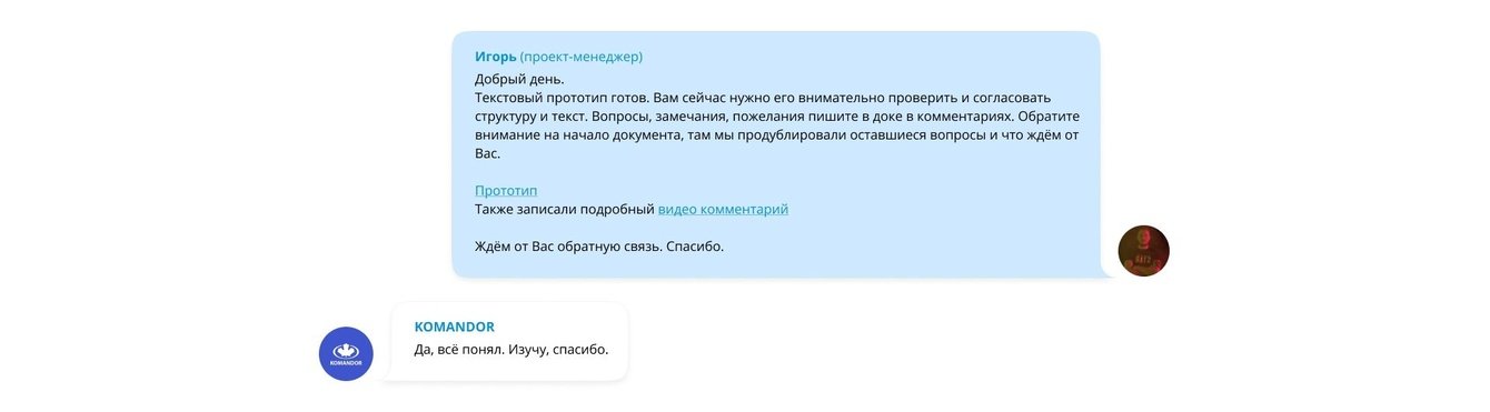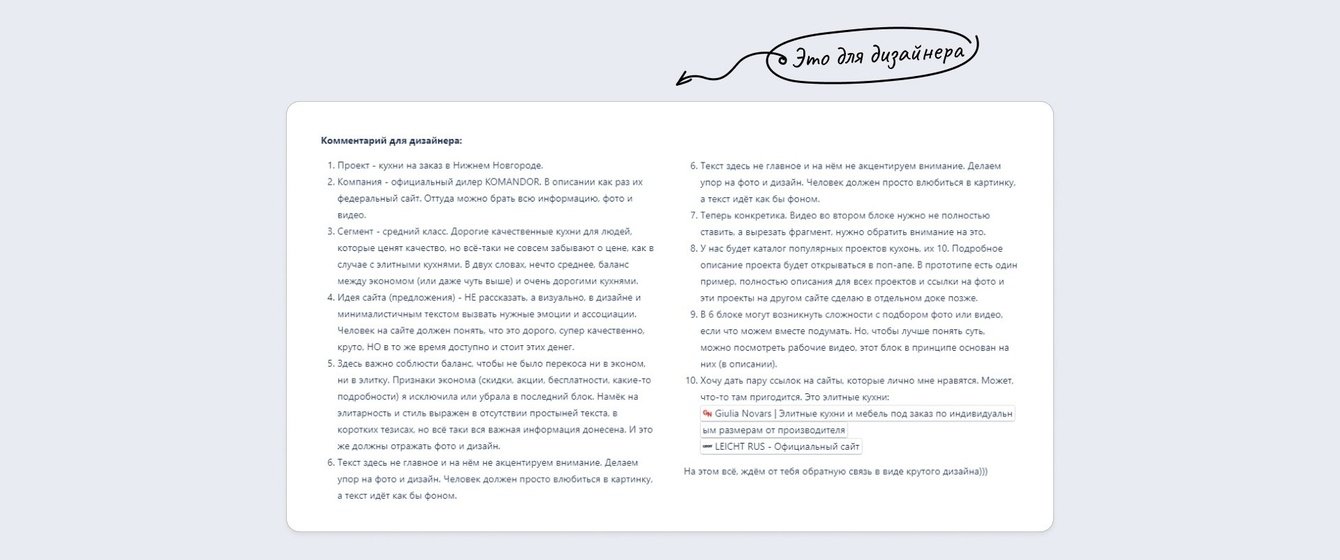 Чтобы ничего не потерялось при переходе на следующий этап, составляем такое резюме специалисту, который будет продолжать работу над проектом.