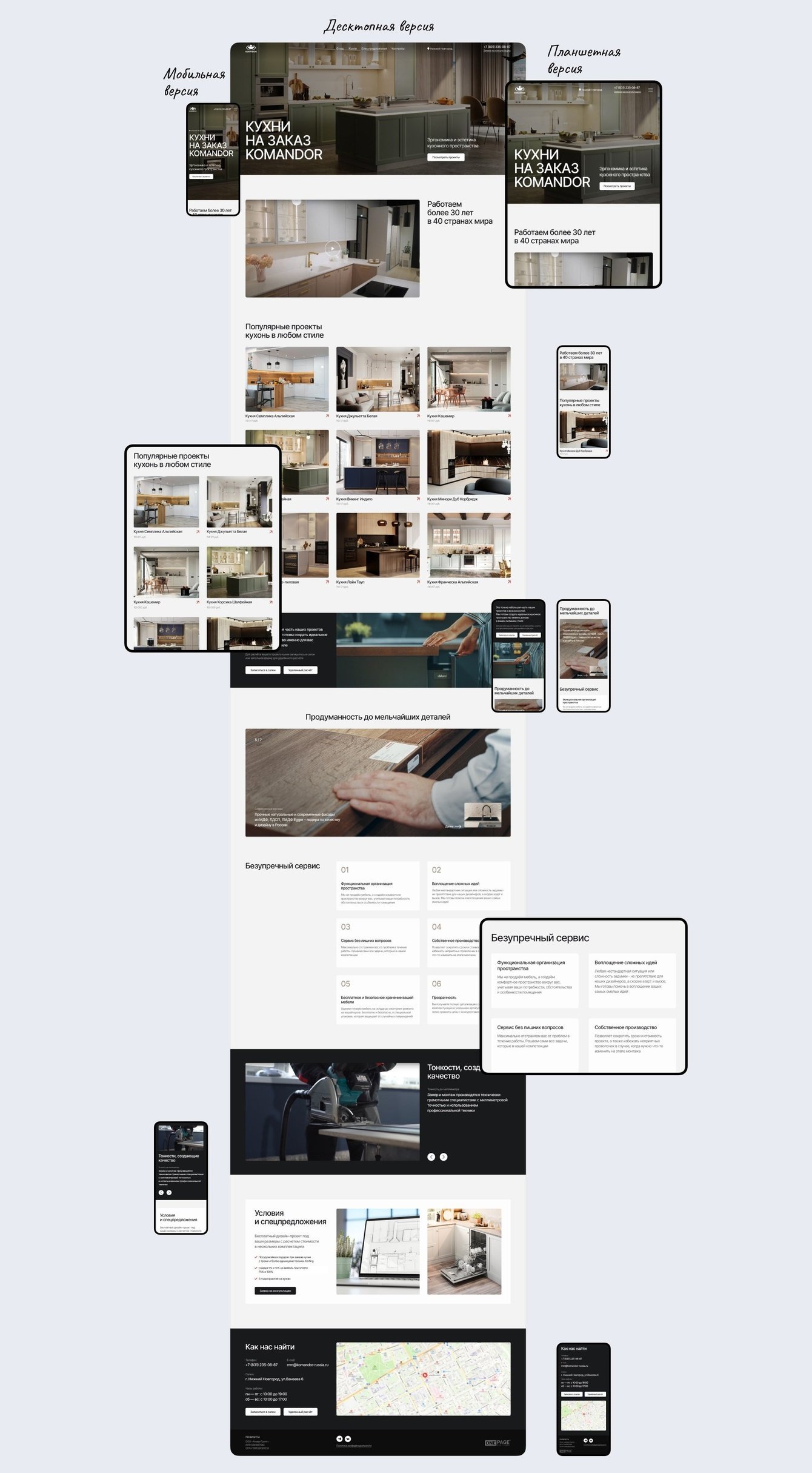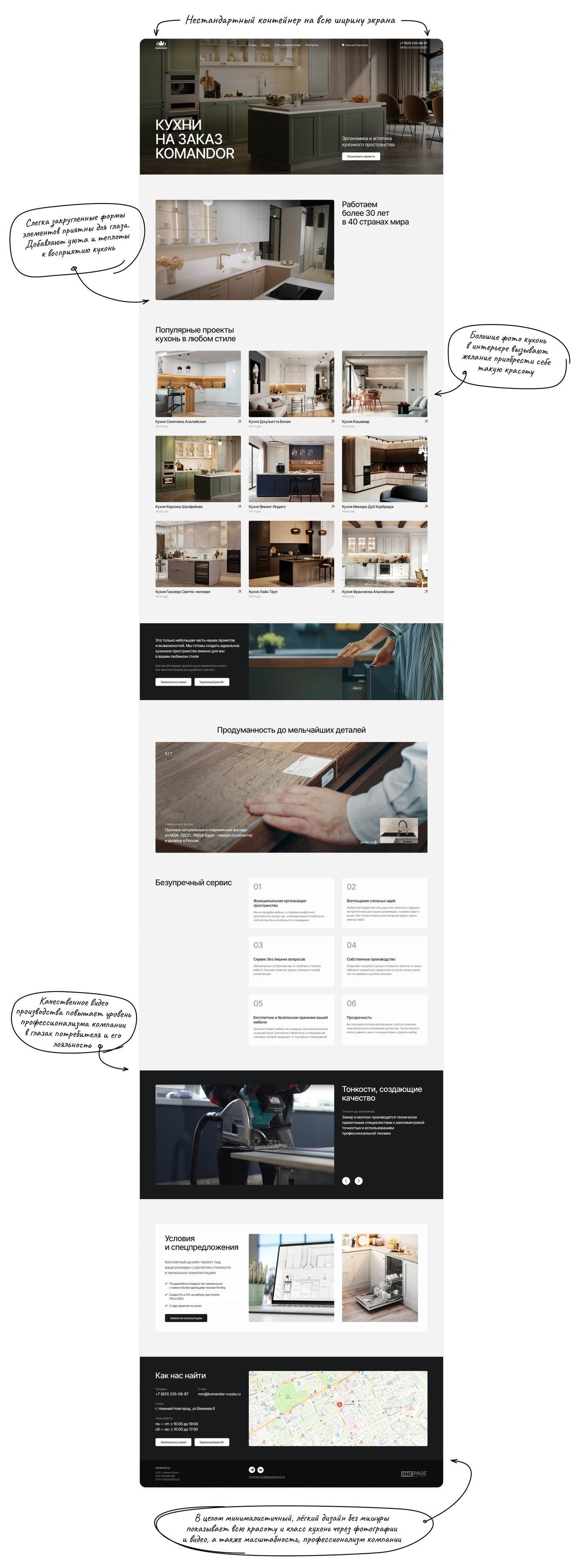 Заказчик - официальный дилер Komandor и производитель кухонь на заказ. Пришел с задачей разработать посадочную страницу для услуги - кухни на заказ. А также грамотно упаковать услугу, так как кухни не дешёвые, но и не элитные.
