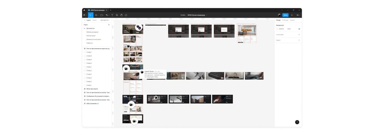 Второй вариант сделали с более классической шириной контентной части. Из-за этого пришлось типографику уменьшить, но большие фото постарались сохранить. Например, каталог реализовали в виде слайдера с фото на весь экран, чтобы сохранить масштабность и показать красоту кухонь.