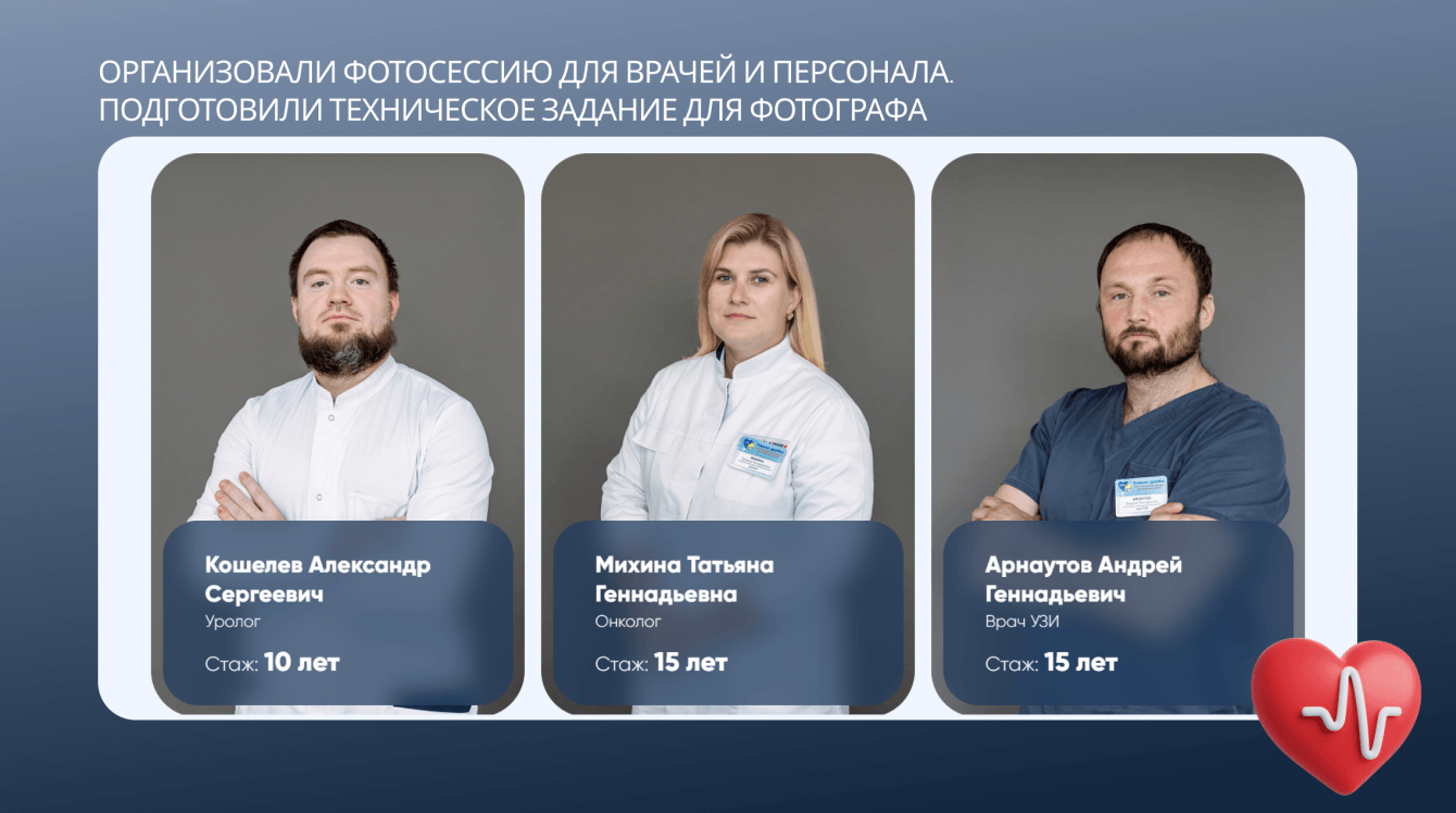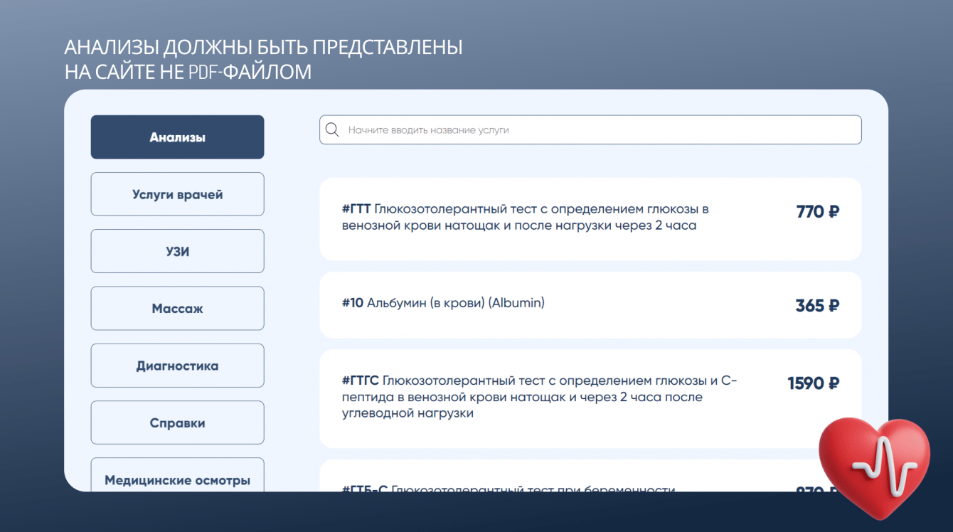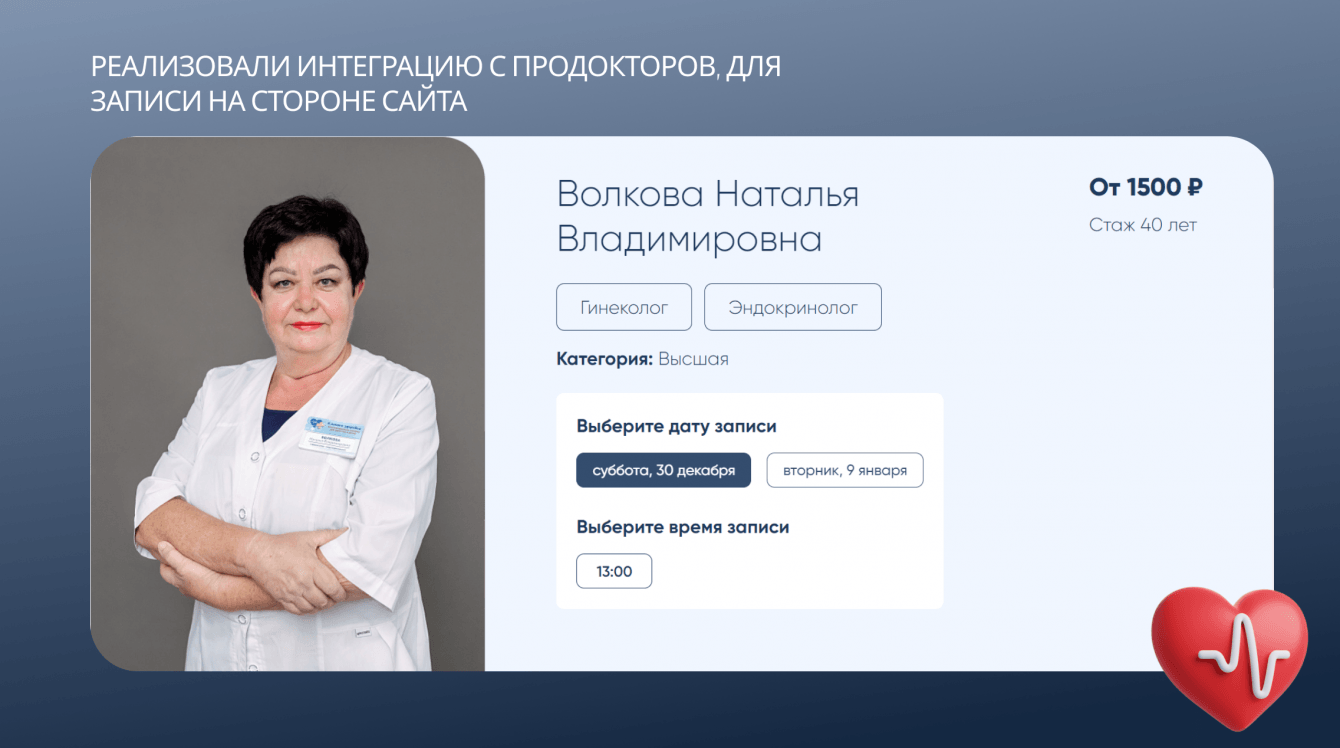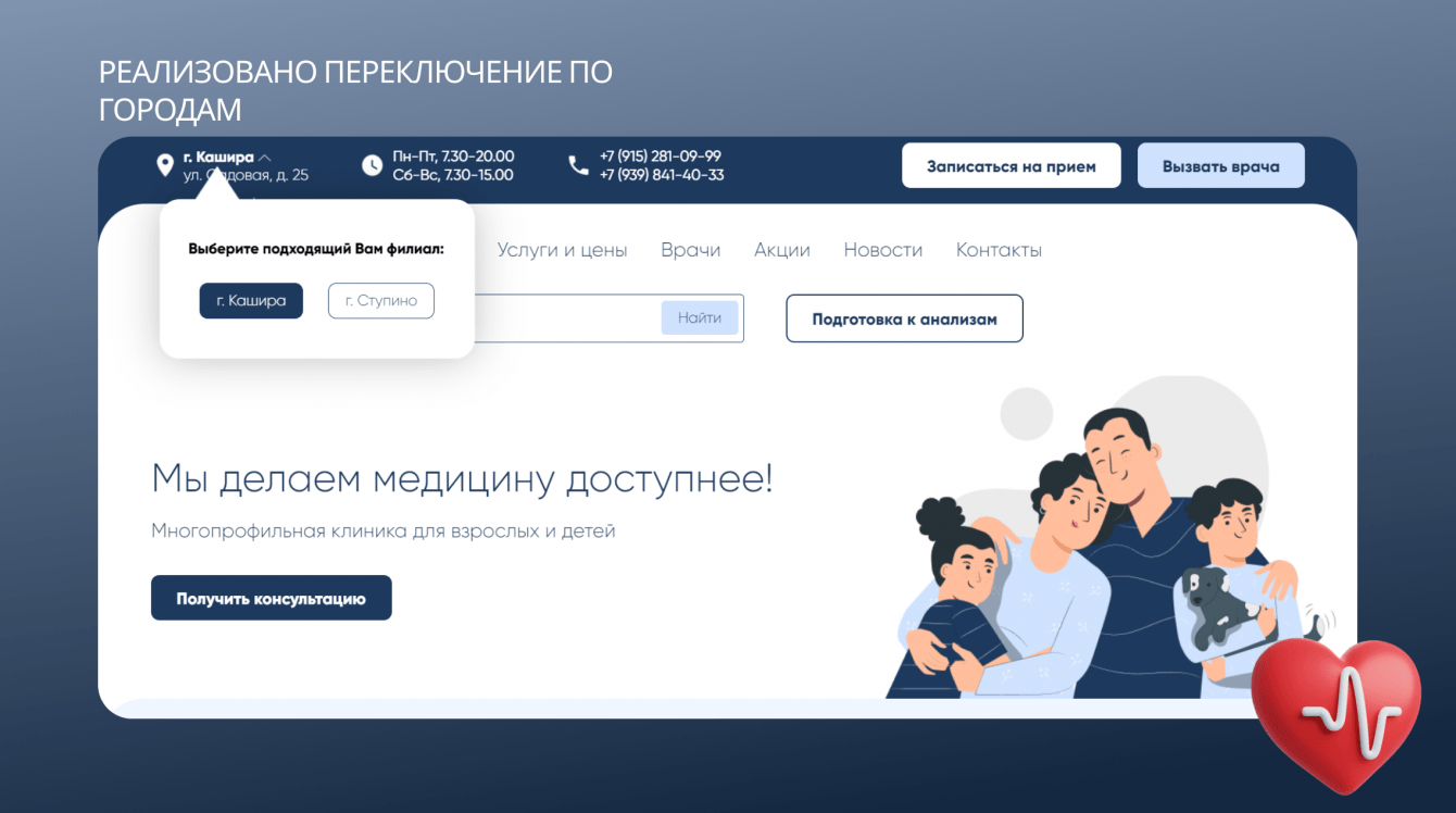 Клиент пришел с задачей сделать сайт с нуля. Технического задания не было, представления, как должно быть тоже. При этом нужно было реализовать проект в максимально сжатые сроки. Медицинский центр состоит из двух филиалов в рядом расположенных городах: Ступино и Кашира. Состав врачей был разный, набор услуг тоже. Также нужна была интеграция с ПроДокторов, но клиент хотел, чтобы запись происходила не в шаблоне этой CRM, а на странице сайта. Также стояла задача выложить на сайт анализы, которые делает клиника. Выложить эти анализы необходимо было не в формате прайса PDF, а оформить на сайт. Прайсы были, но в общей сложности анализов более 4000.
