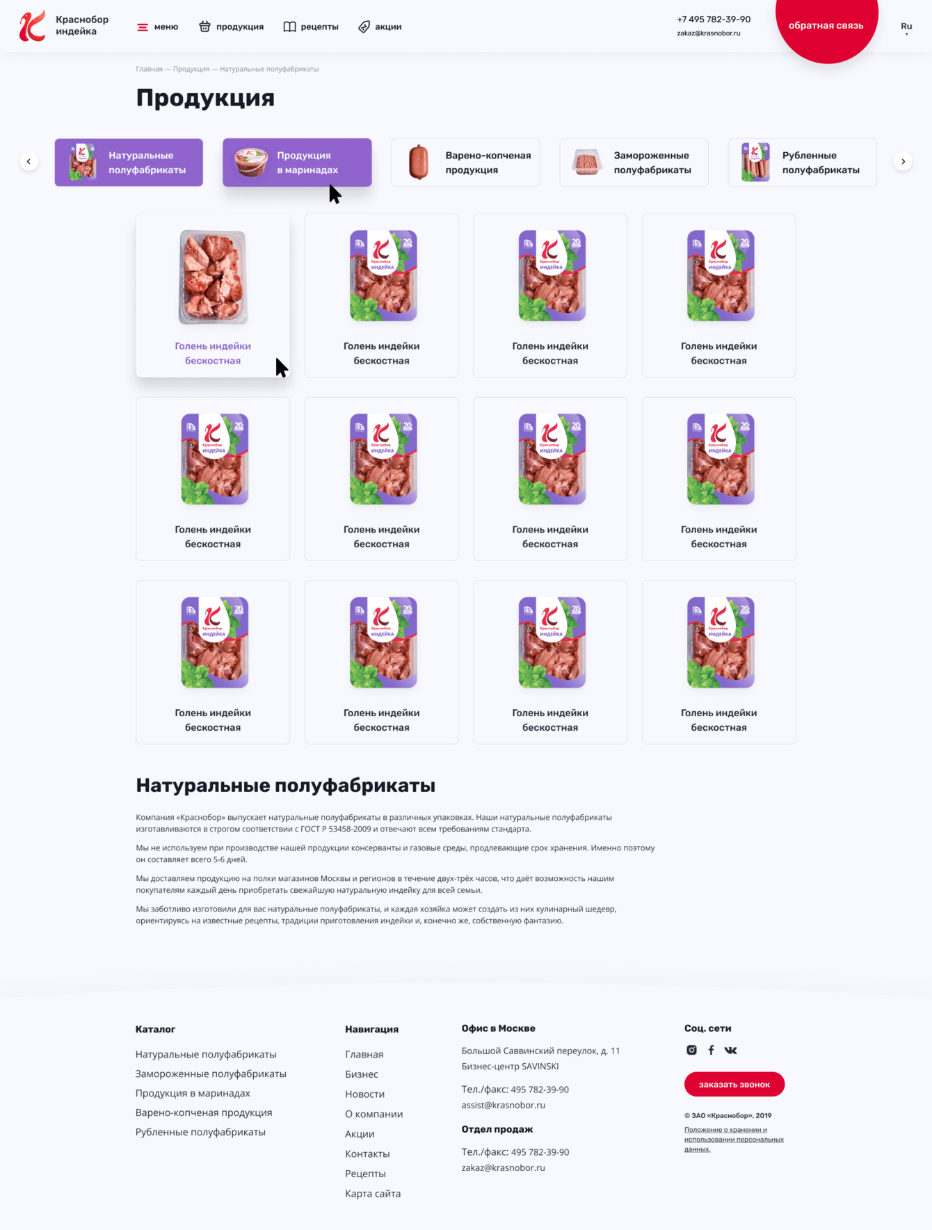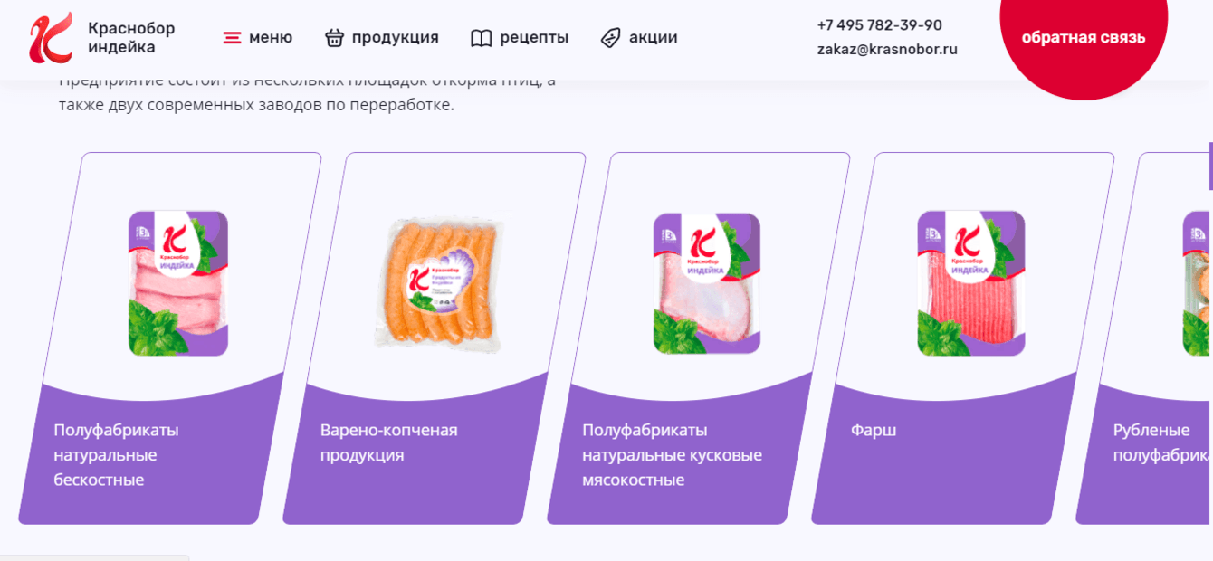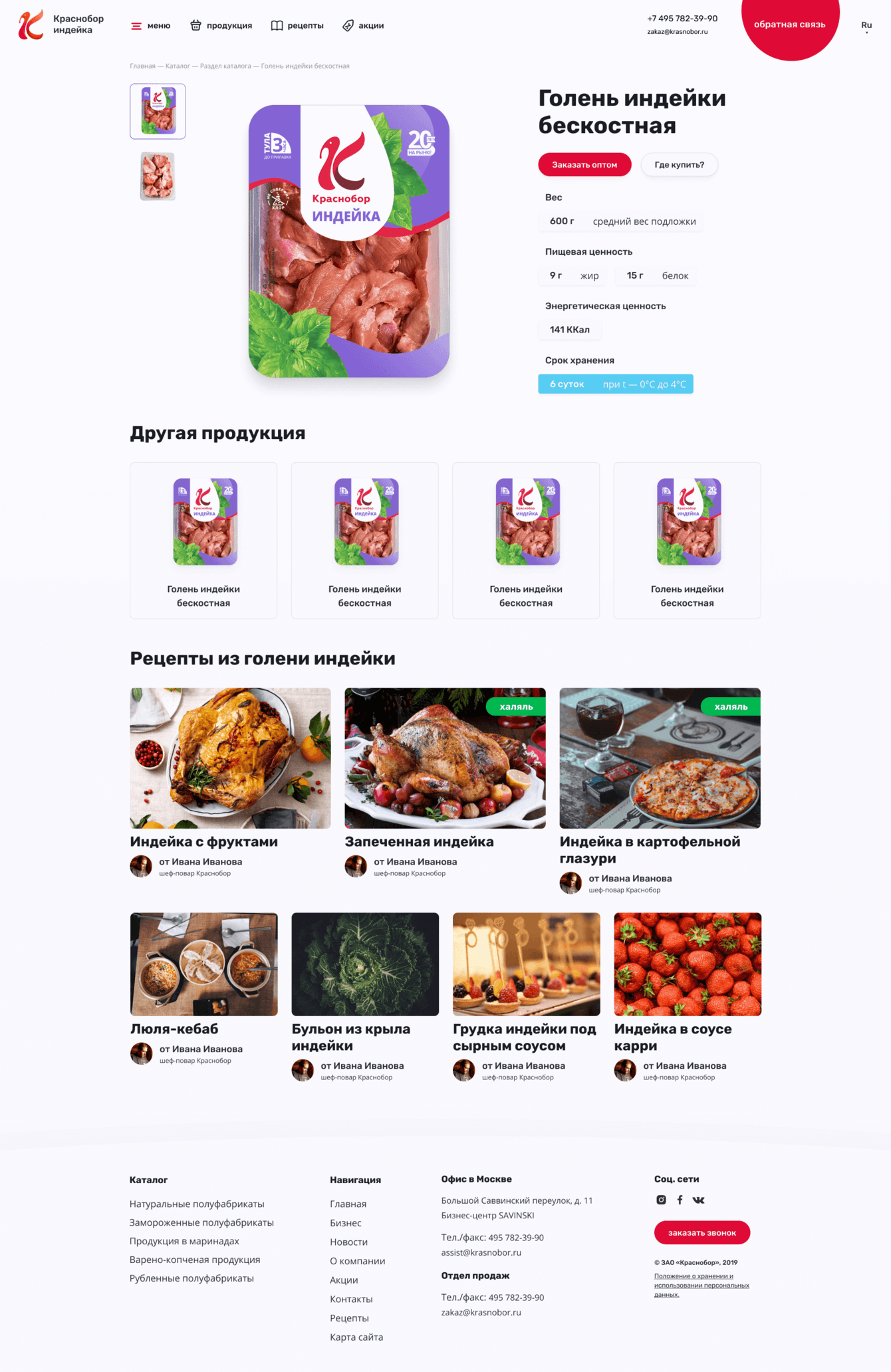 Производитель способен закрывать большие объемы поставок мяса из индейки. Краснобор является одним из лидеров рынка в своем сегменте. Целевая аудитория компании – крупные продуктовые сети, то есть B2B сегмент. Конечный же потребитель – люди, которые готовят еду дома, столовых, ресторанах или других местах. Чаще всего продукт покупают домохозяйки. Мы учитывали этот факт при разработке дизайна сайта.