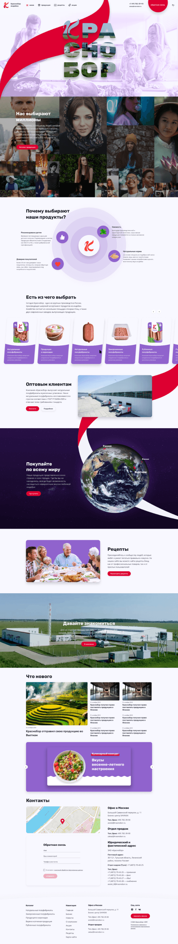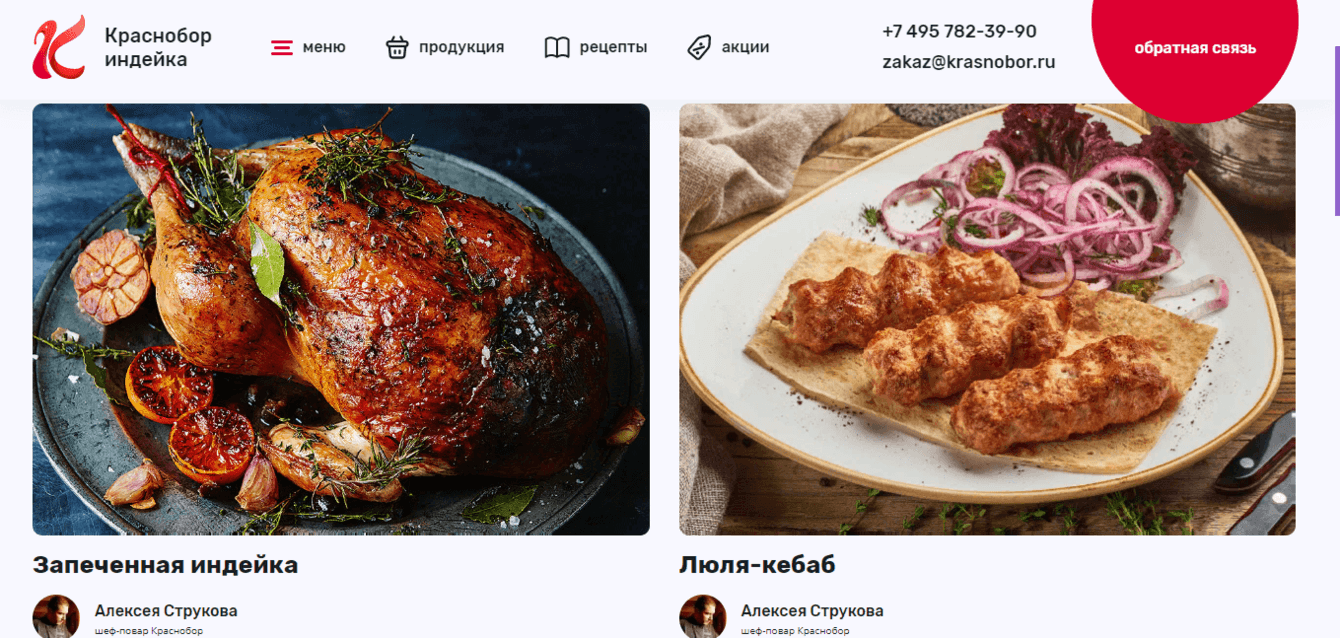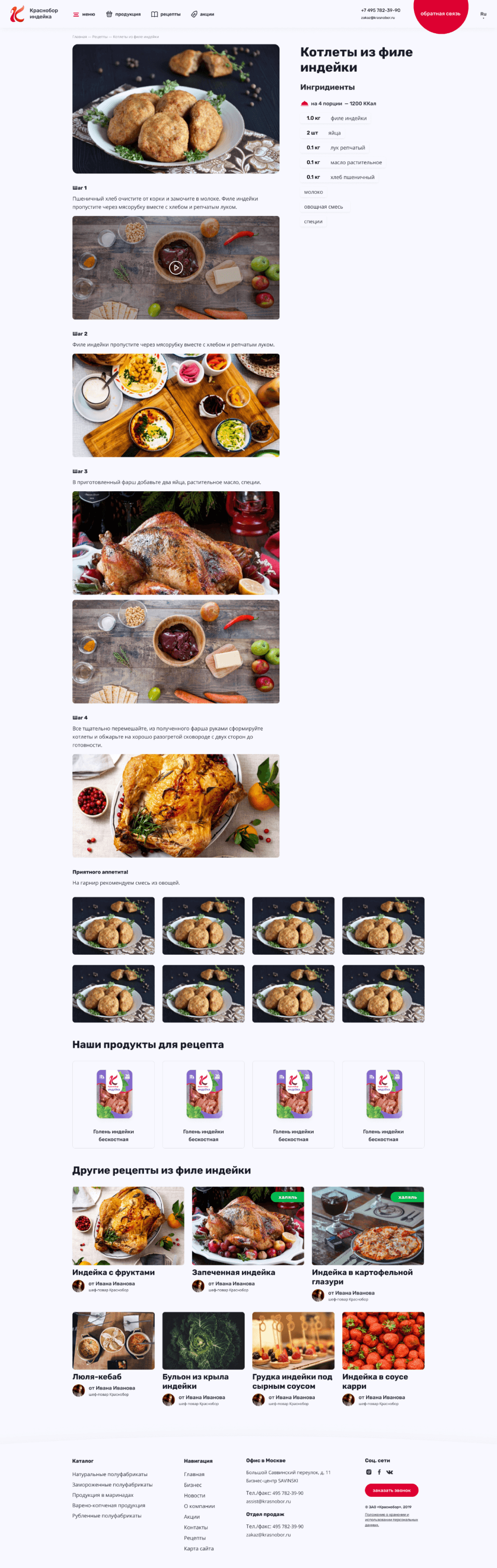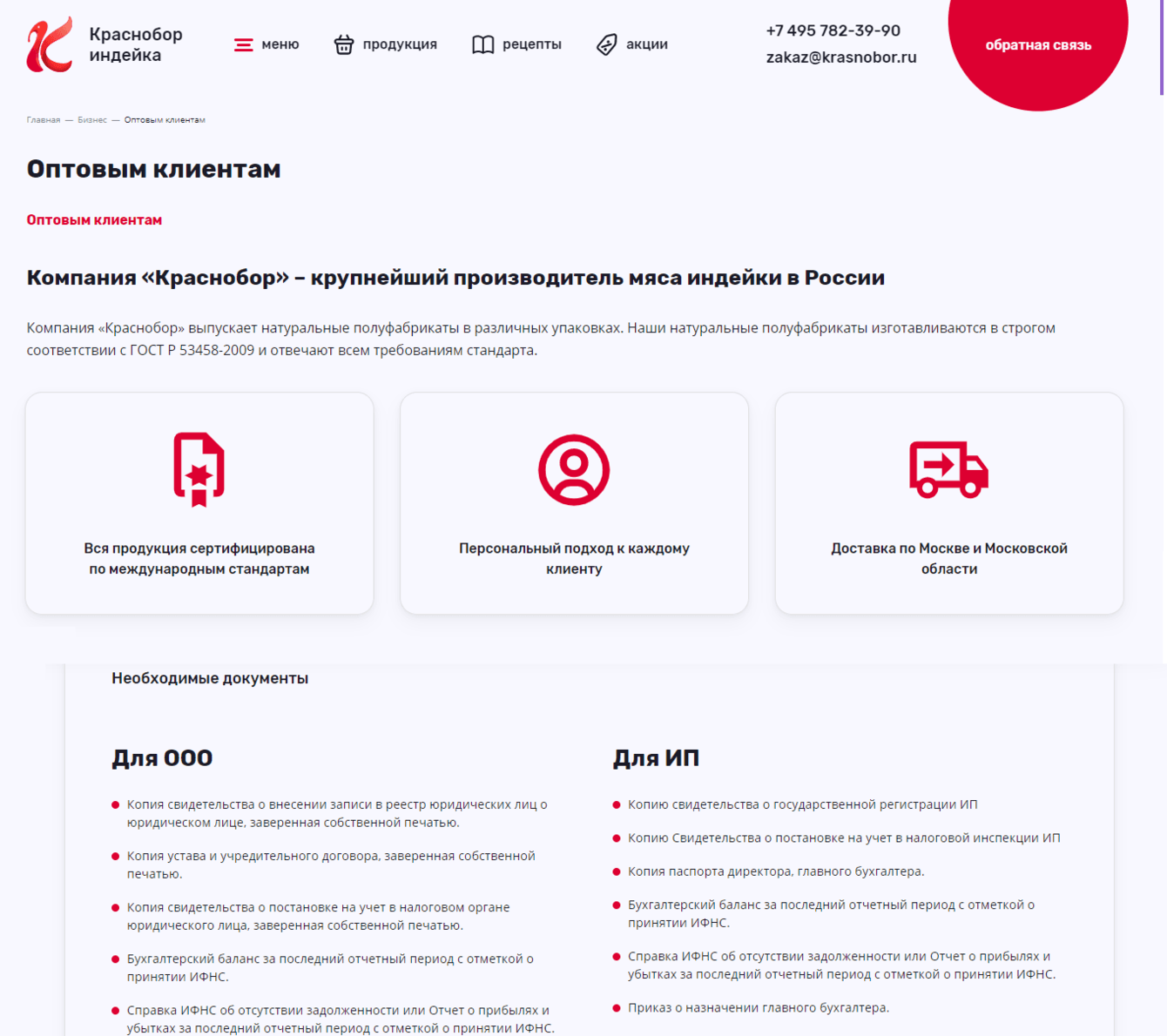 Производитель способен закрывать большие объемы поставок мяса из индейки. Краснобор является одним из лидеров рынка в своем сегменте. Целевая аудитория компании – крупные продуктовые сети, то есть B2B сегмент. Конечный же потребитель – люди, которые готовят еду дома, столовых, ресторанах или других местах. Чаще всего продукт покупают домохозяйки. Мы учитывали этот факт при разработке дизайна сайта.