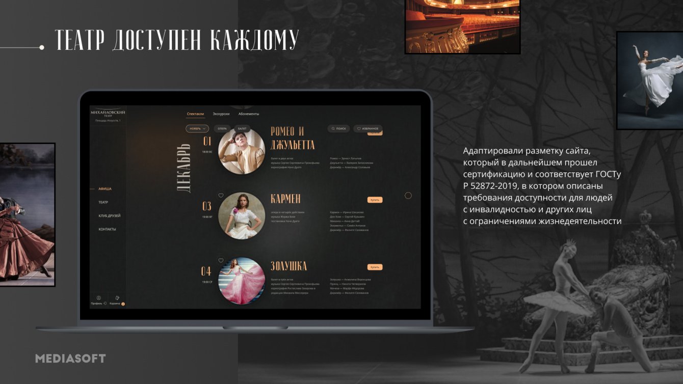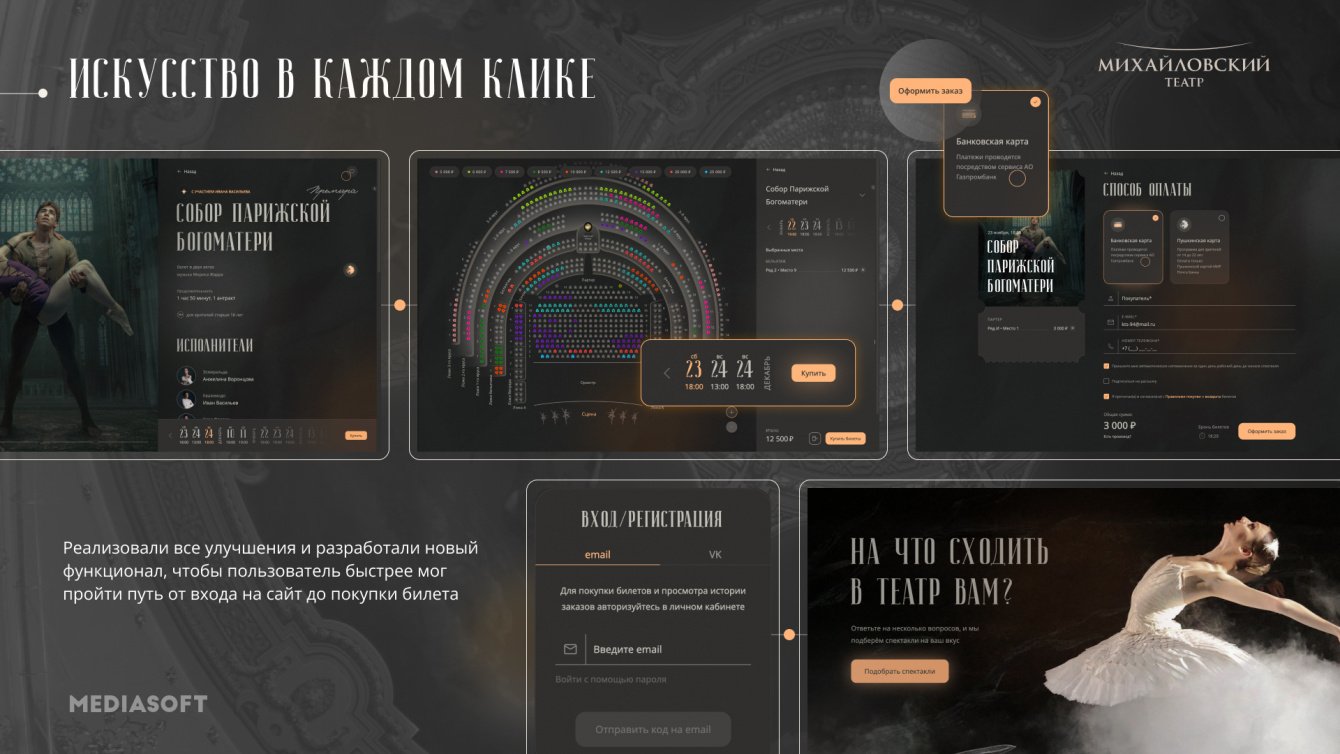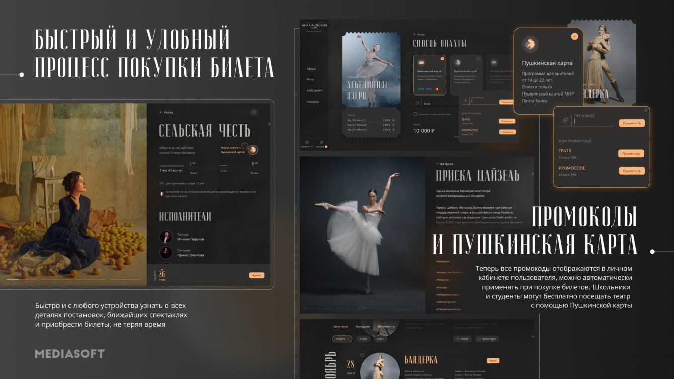 При взаимодействии с сайтом Михайловских театр пользователь с первых секунд чувствует полное погружение в атмосферу светского театра. Плавная работа дает возможность проникнуться воссозданной на сайте театральной сцене. Быстро и с любого устройства узнать о всех деталях постановок, ближайших спектаклях и приобрести билеты, не теряя время.