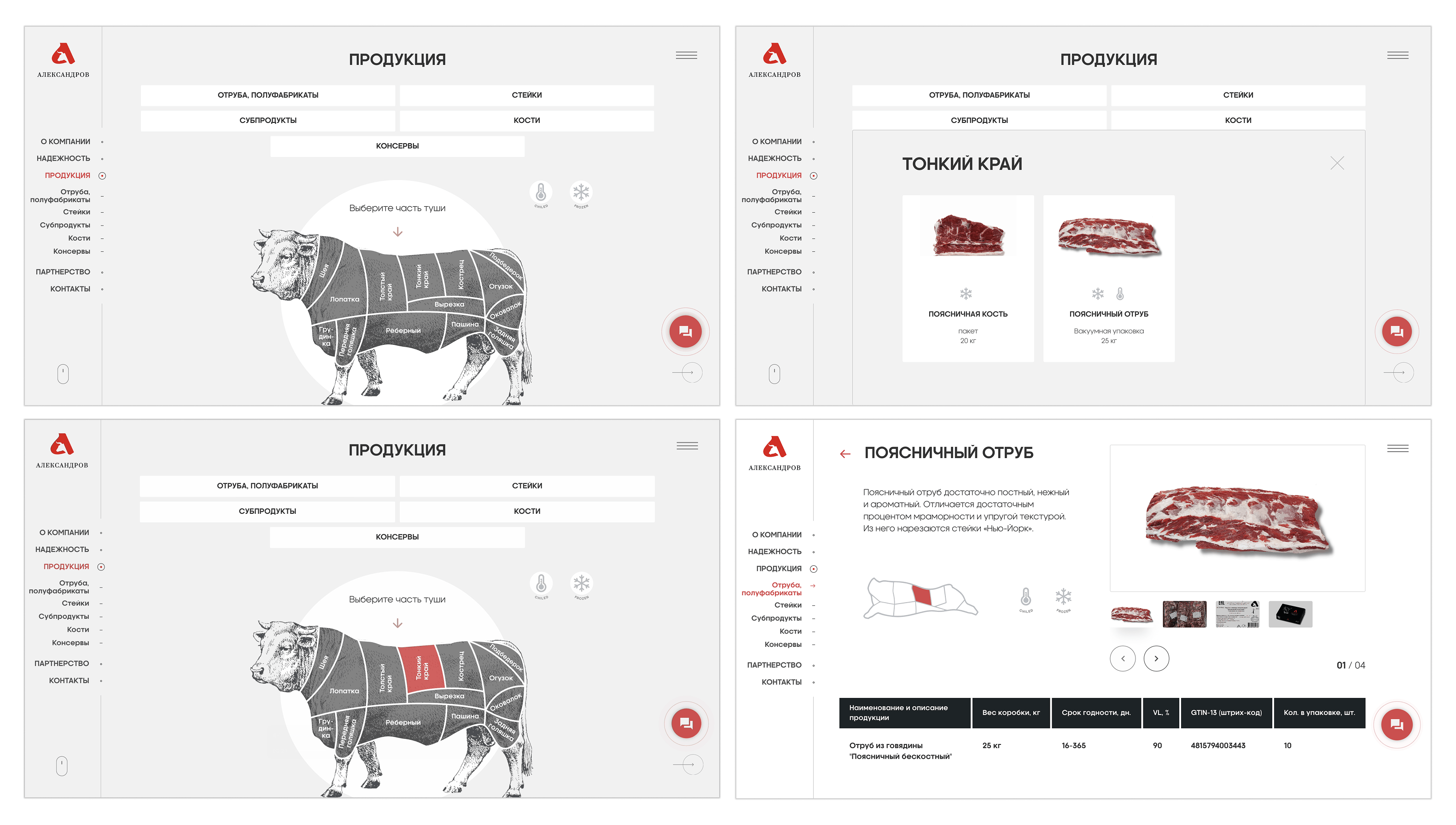 Каталог — вторая особенность проекта. Вместо стандартного списка или сетки товаров реализовали интерактивного быка. Пользователь может выбрать часть туши непосредственно на изображении, после клика он выбирает конкретную позицию и переходит в карточку товара с подробной информацией. Такого решения не было ни у кого из конкурентов.