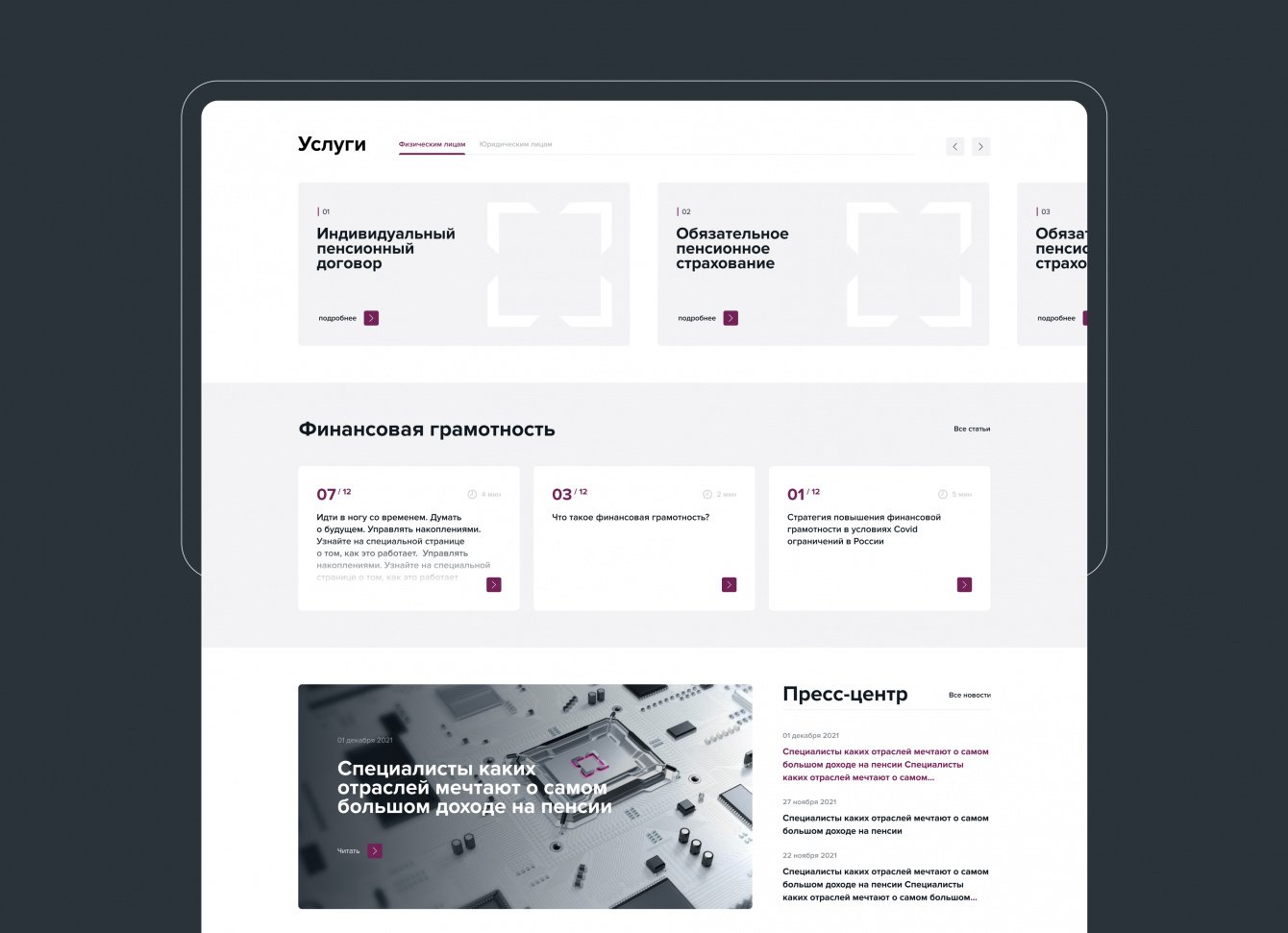 Разместили подробную информацию о пенсионных программах, включая их особенности, условия участия и возможности накопления в удобном формате. Подобрали инфографику, чтобы информация считывалась мгновенно и без лишних затрат.