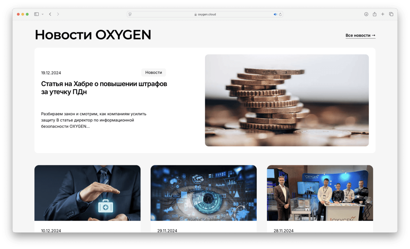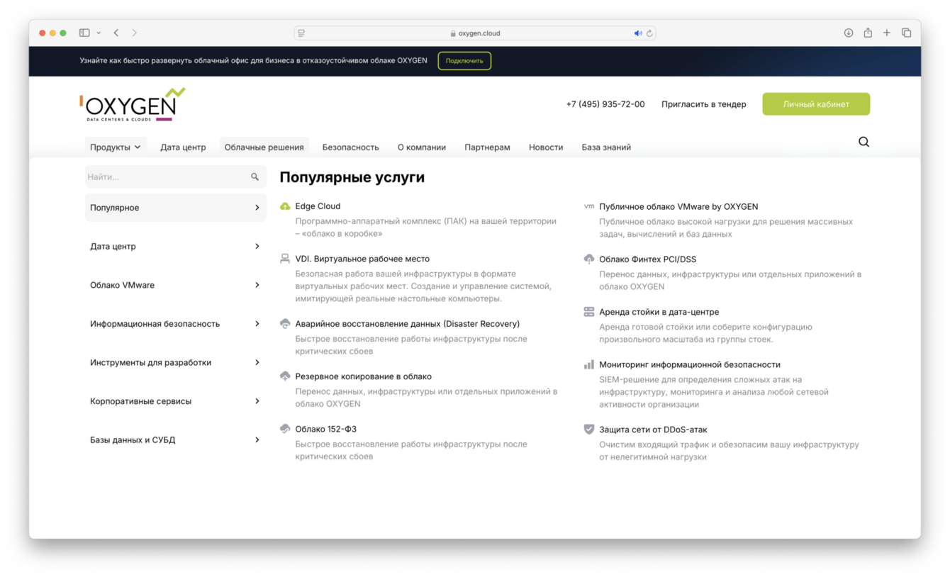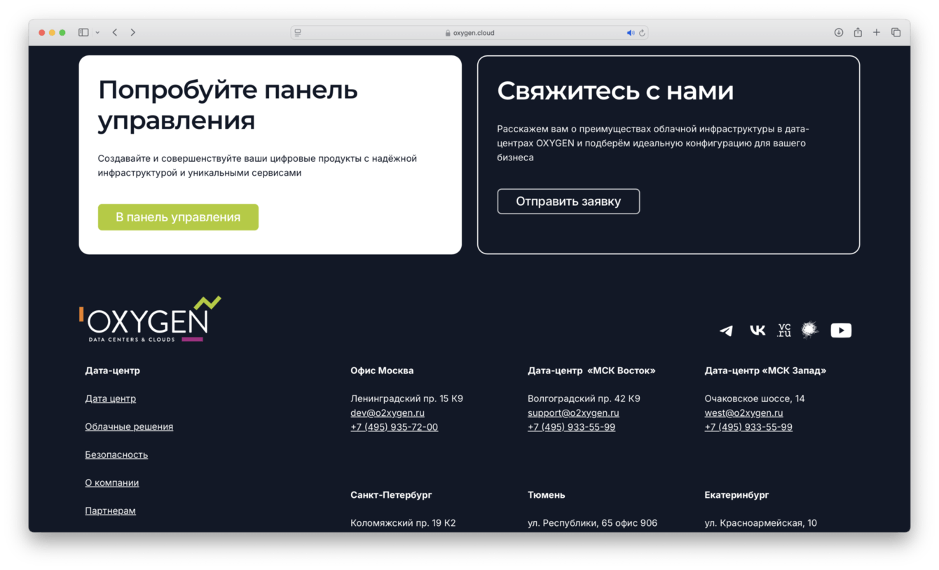 Компания О2КЛАУД получила красивый, удобный корпоративный сайт. Возможность управлять контентом на сайта собственными силами, легко и в нужный момент, без привлечения сторонних специалистов. Гибкая и удобная система навигации по сайту, SEO оптимизация каждой страницы в рамках сайта, безграничные возможности для масштабирования.