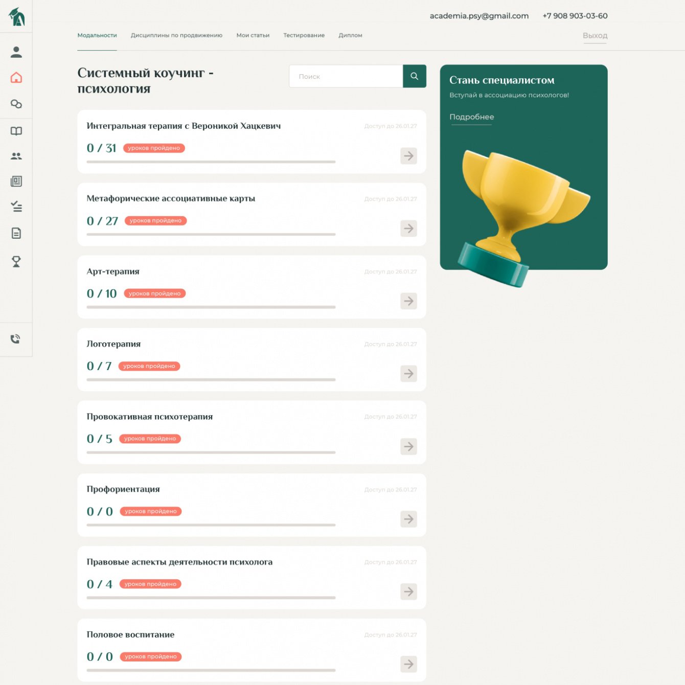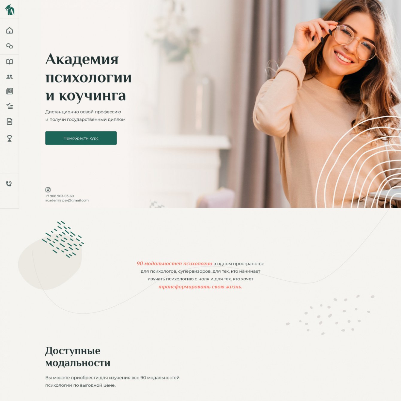 Академия психологии предлагает обучение по 70 модальностям психологических направлений. Цель сайта — показать спектр услуг компании и помочь потенциальному клиенту найти подходящее именно ему курс.