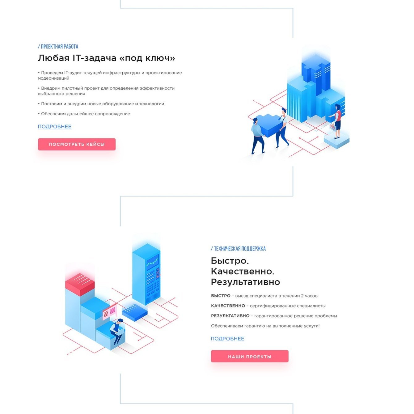 1. Главная страница сайта пошагово знакомит пользователя со спектром услуг компании, на каждом шаге давая ссылки на соответствующие детальные страницы. Такая поэтапная подача информации удерживает внимание клиента, а также помогает найти и определиться в том, что именно ему необходимо. А попасть на искомую страницу он сможет всего в один клик.