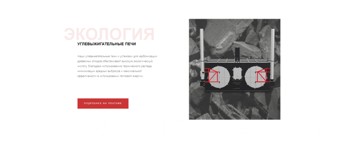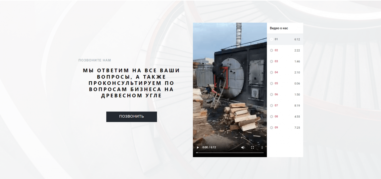 На главной странице сайта реализована обширная галерея видео, демонстрирующая работу углевыжигательных печей и комплектующих. Это позволяет потенциальным клиентам наглядно оценить эффективность и качество продукции перед покупкой.