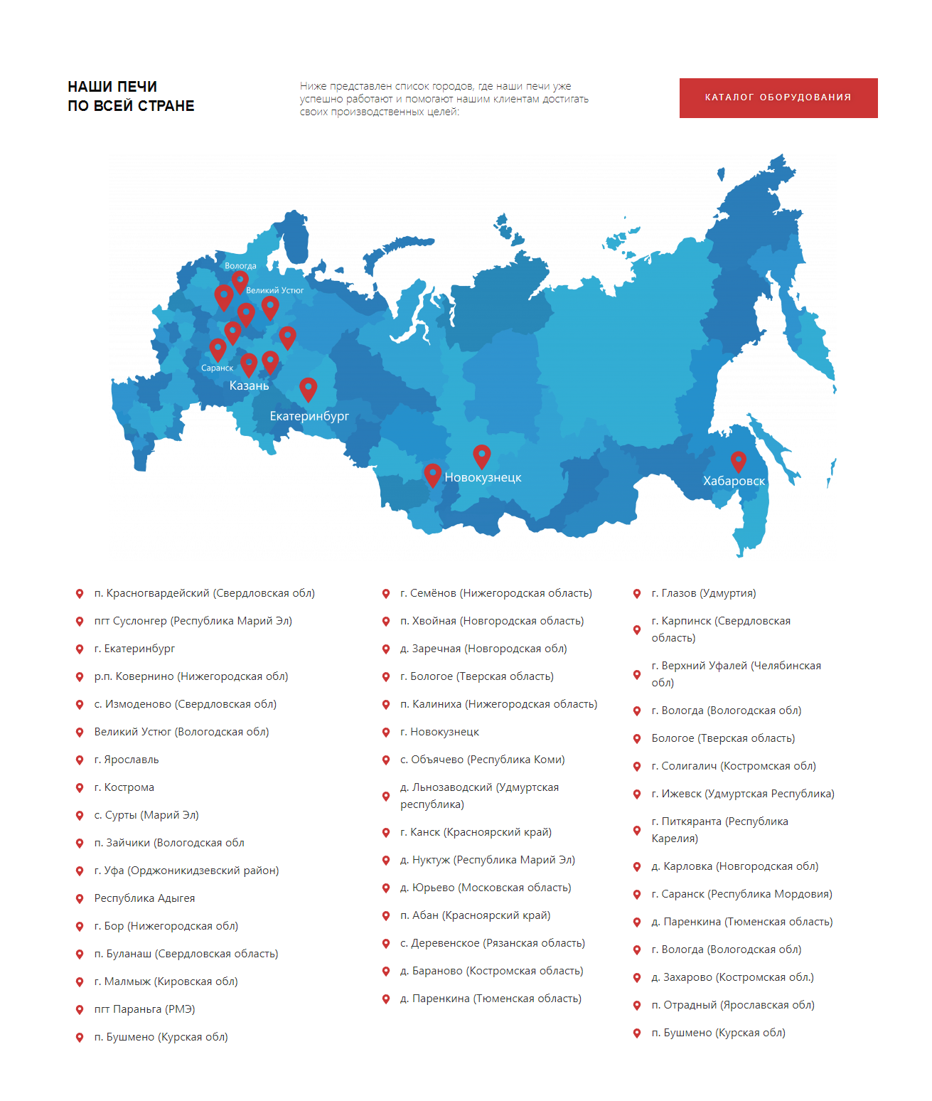 - Интеграция карты с отметками всех регионов, где активно работают печи компании.