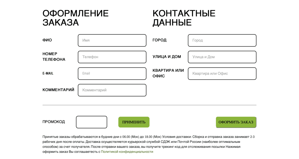 Страницу с корзиной выполнили в похожем минималистичном стиле: у каждого товара есть указание цены и количества, ниже – строки для заполнения контактных данных.