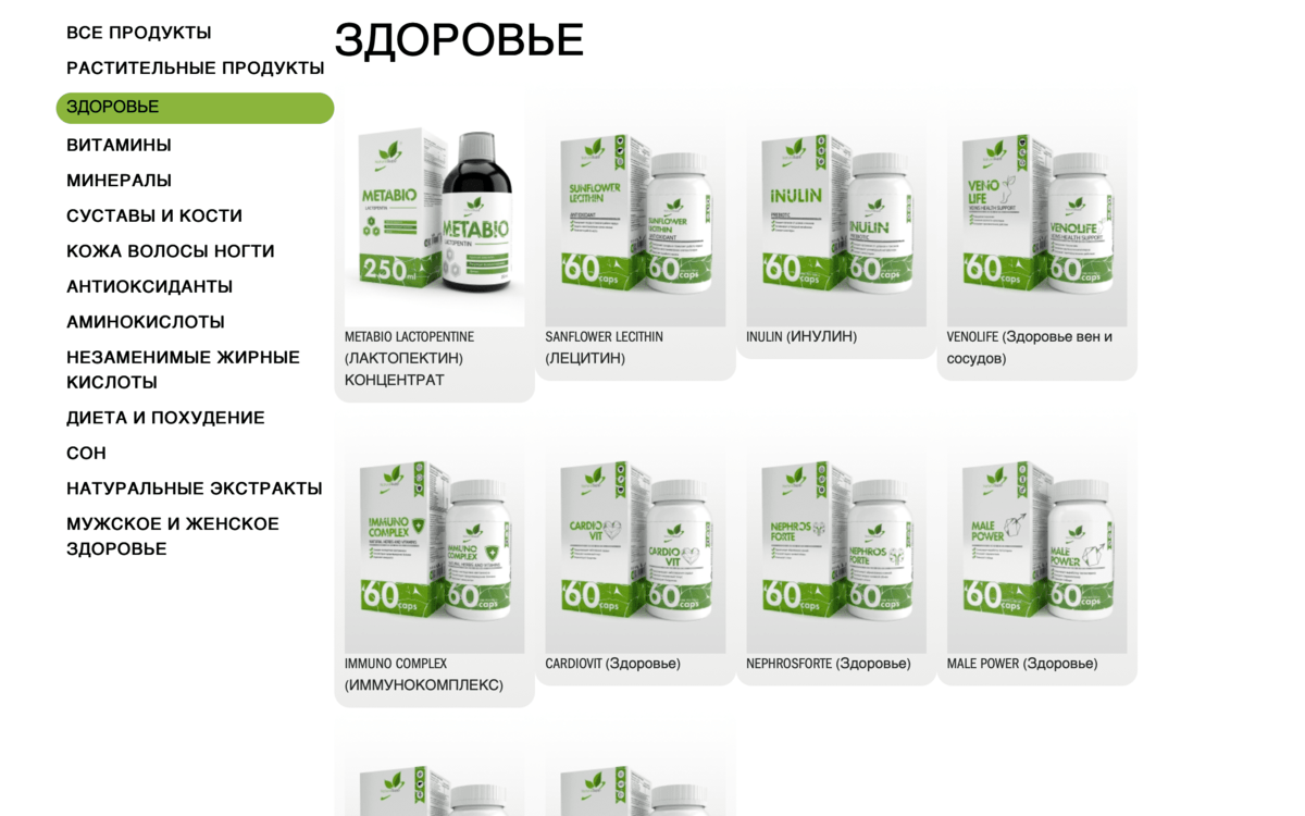 Продукцию в каталоге поделили на несколько простых категорий: диета, сон, суставы, витамины, растительные продукции и прочее. В случае с продажей БАДов это единственно верное решение. Любой сегмент ЦА, будь то простой покупатель или потенциальный партнер, должен легко ориентироваться по вкладкам каталога товаров.