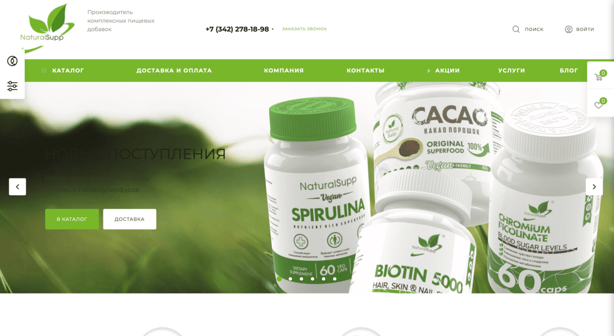 Naturalsupp – пермский производитель комплексных пищевых добавок и БАД. Компания регулярно пополняет ассортимент новинками и предлагает выгодные условия сотрудничества для партнеров. Мы познакомились с клиентом в конце 2020 года. На тот момент у клиента не было собственного сайта, продажи велись через соцсети или сарафанное радио.