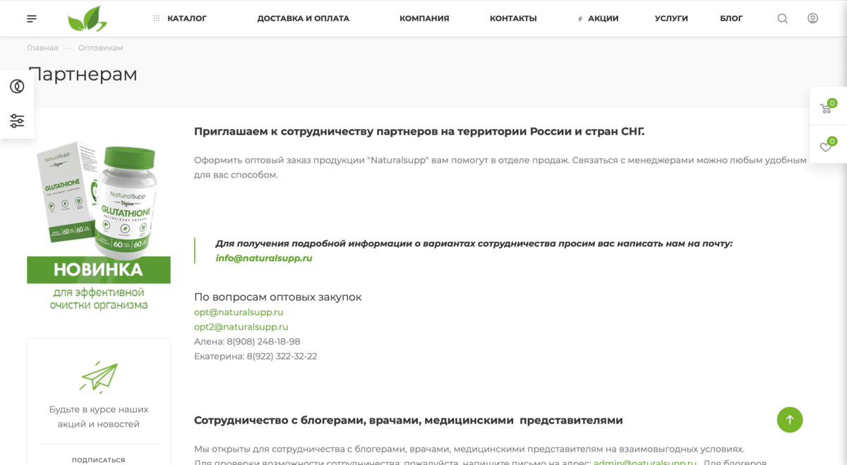 – Партнеры – оптовые клиенты. Юридические лица, которые готовы напрямую сотрудничать с производителем комплексных добавок. Этот сегмент ЦА ищет выгодные условия партнерства. Цель сайта – показать преимущества сотрудничества с брендом Naturalsupp.