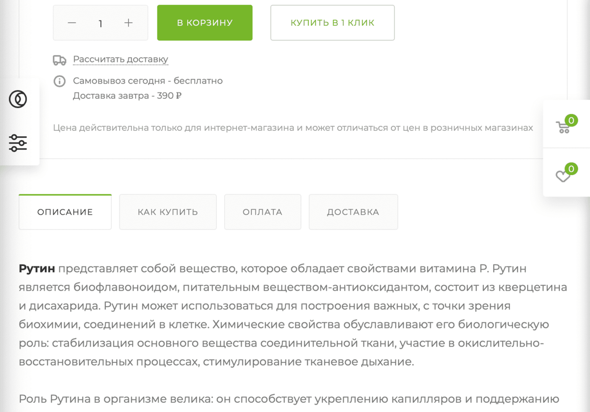 В карточку товара поместили основную информацию о продукте. Чтобы уместить объемные тексты на одной странице, разбили информацию по категориям и поместили в отдельные вкладки. Это легко сделать на платформе 1С-Битрикс, на которой мы и разрабатывали сайт. Мы просчитали примерное количество целевых действий посетителей и сделали простую и логичную структуру страниц, где пользователя ничего не отвлекает от покупки.