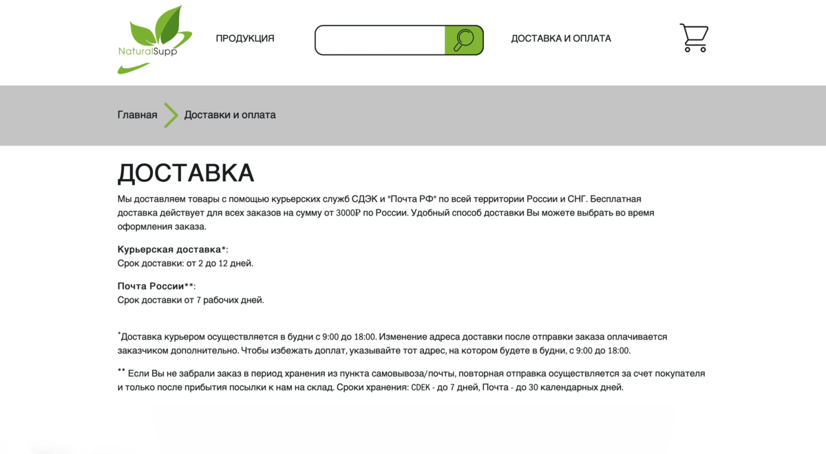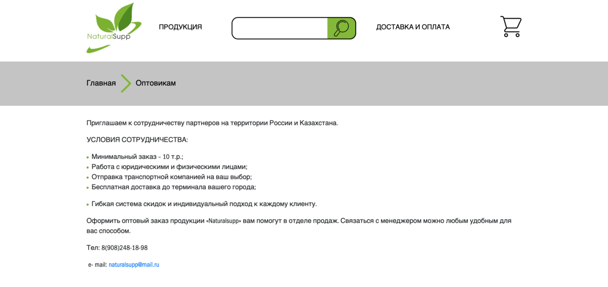 Цель разработки сайта – познакомить потребителей и партнеров с брендом Naturalsupp и познакомить с условиями сотрудничества.