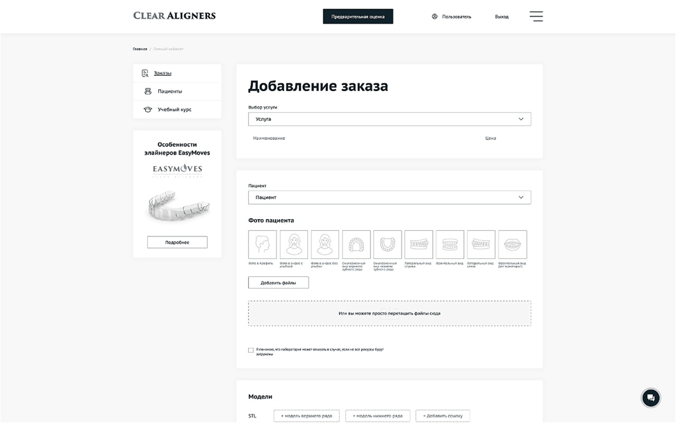 Личный кабинет пользователя (врача) имеет раздел Заказов, Пациентов, а также учебный курс. На странице Заказов отображаются заказы клиента вместе с их параметрами и статусом. В каждый заказ можно перейти для детального просмотра его свойств. По кнопке “Добавить” можно создать новый заказ.
