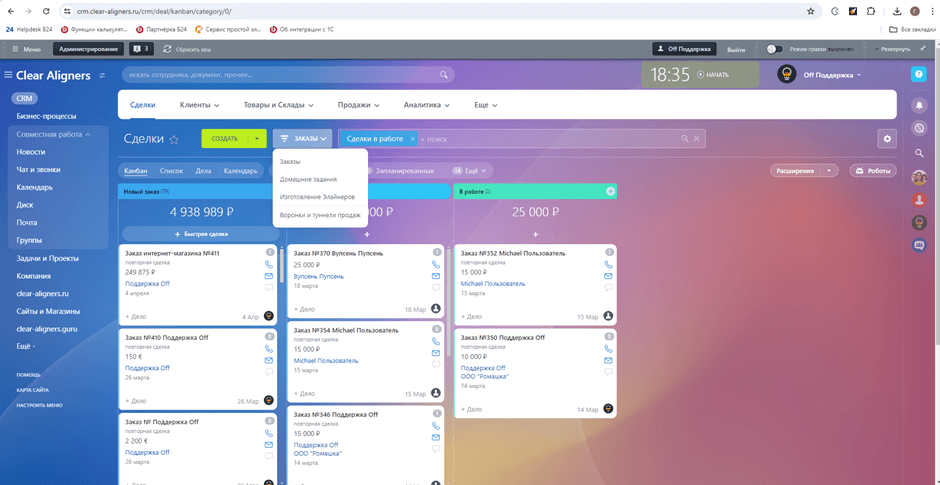 Все заказы попадают в CRM Битрикс24 в воронку “Заказы”. Если заказ с изготовлением Элайнеров, то создастся вторая сделка в воронке “Изготовление Элайнеров”. Все ответы на домашние задания создаются в воронке “Домашние задания”.