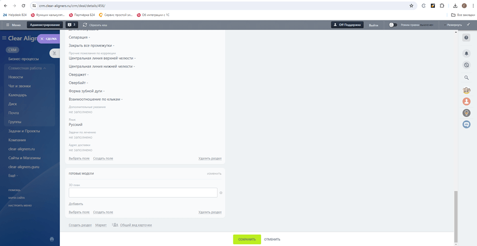 На каждой стадии сделки клиент получит уведомление о статусе своего заказа. При подготовке индивидуального плана лечения формируются ссылки на 3D-модели лечения, а при проверке ДЗ текстовое описание и ссылки на видео-пояснение ответа, поэтому часть информации из полей сделки дублируется в заказ на сайте клиенту. Например, заполнив поле “3D план” в сделке клиент увидит ссылку в ЛК.