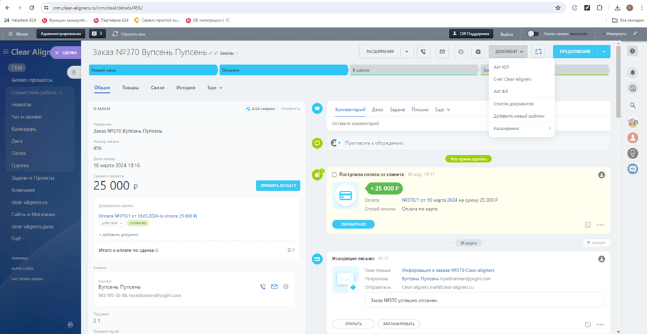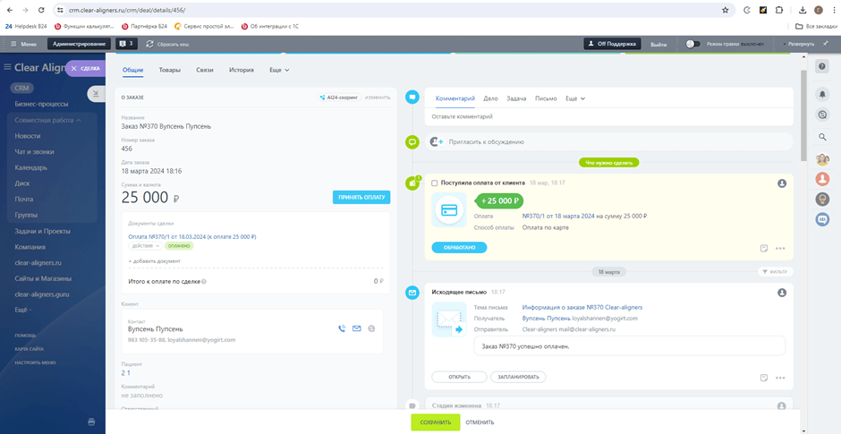 Оплата клиента отслеживается в CRM при помощи триггеров оплаты. Когда оплата поступит, это отразится делом в таймлайне сделки для менеджера, а клиенту отправится исходящее письмо о том, что его заказ успешно оплачен.