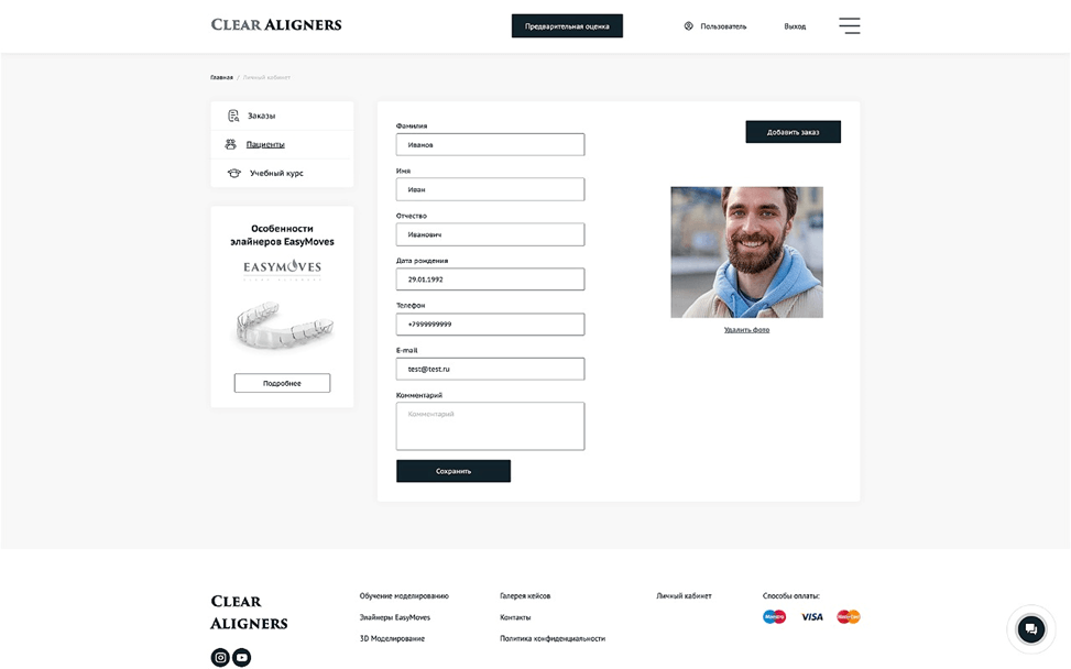 В разделе Пациенты хранятся все созданные врачом пациенты, заказы которых оформляются в компанию Clear-aligners.