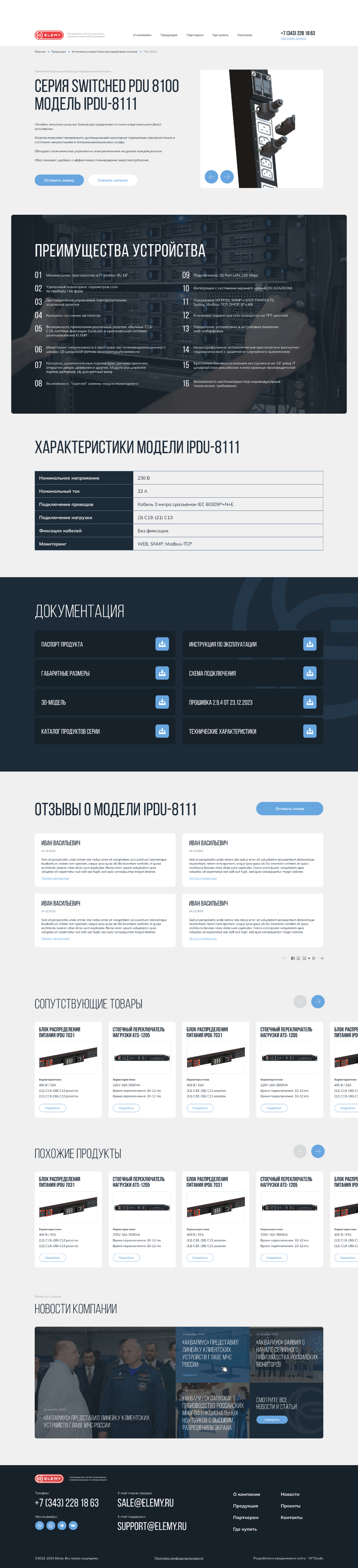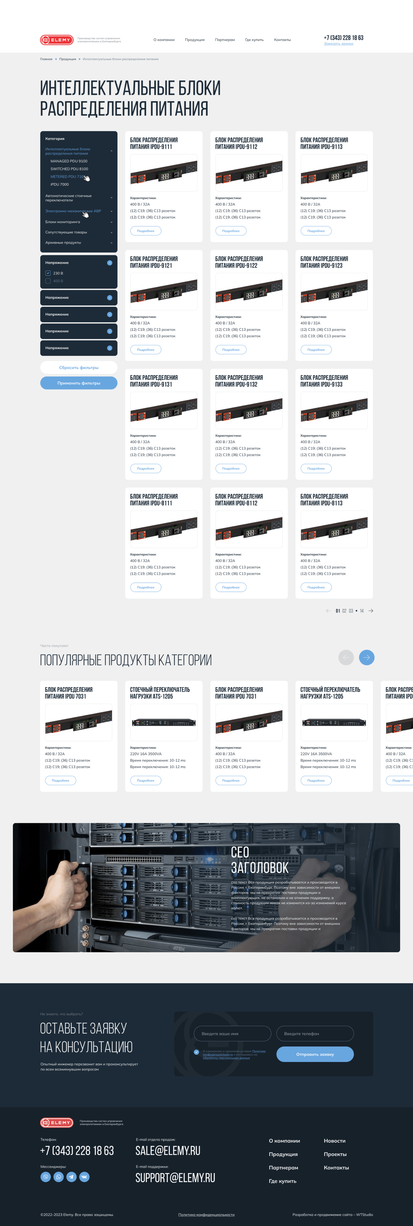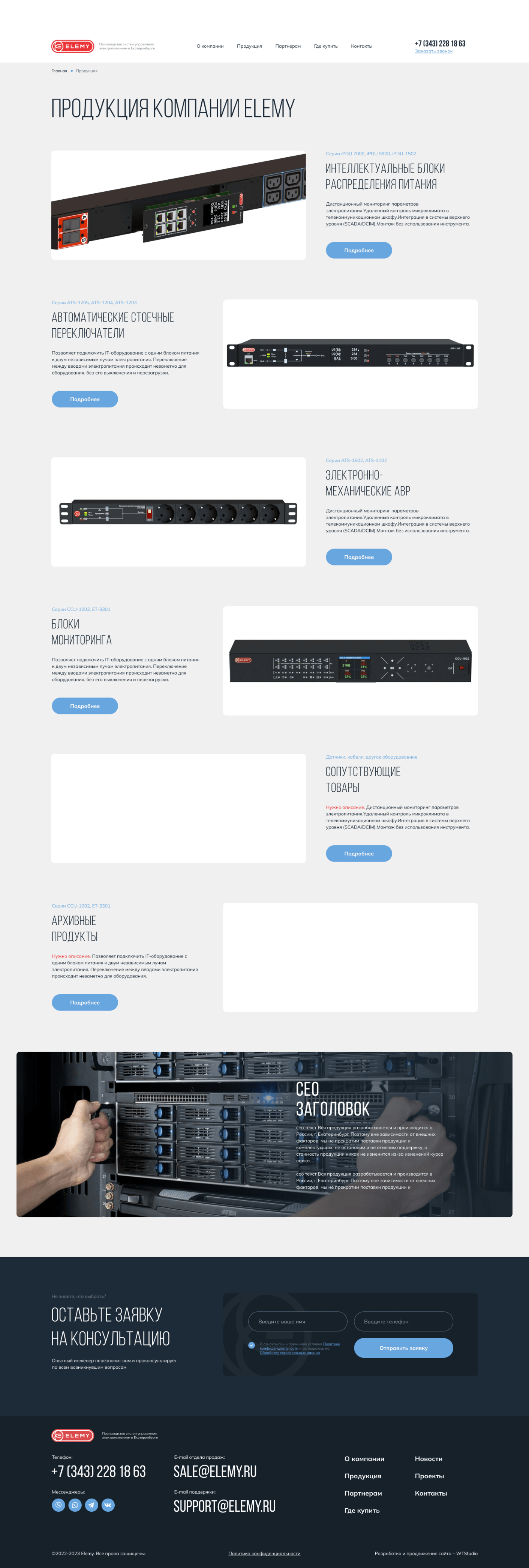 Первым шагом мы провели тщательный анализ бизнес-процессов и требований заказчика, чтобы понять особенности представления продукции. У компании Elemy не стандартное разделение товаров по моделям, что могло бы усложнить навигацию для обычных посетителей. Поэтому было принято решение разработать уникальную структуру сайта, которая вместо привычных категорий делает акцент на удобстве поиска и логичном расположении продуктов.