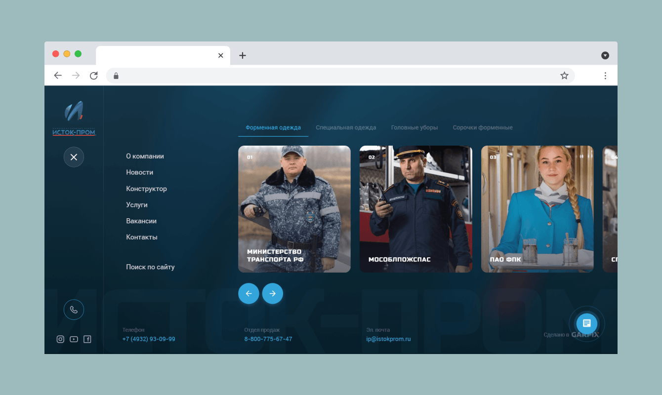 Навигация по разделам осуществляется с помощью скроллинга. Мы создали четыре крупных подраздела в соответствии с коллекциями – форменная одежда, специальная одежда, головные уборы, сорочки форменные. Внутри каждого подраздела есть разделения на одежду для сотрудников разных организаций. Например, в подразделе «Форменная одежда» вы найдете коллекции для сотрудников Федеральной Пассажирской Компании, для Министерства транспорта РФ, для сотрудников ведомственной охраны ЖДТ России и для кадет.