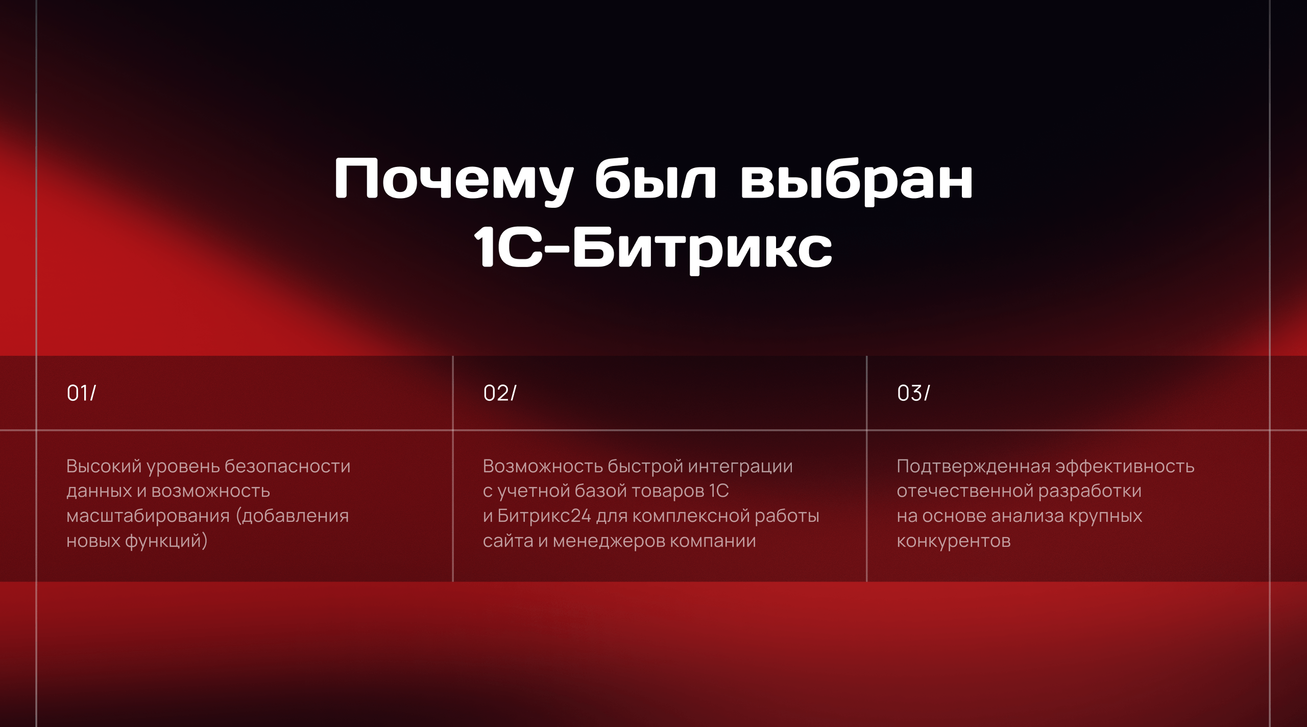 Учитывая бизнес-цель и требования от сайта клиента, на выбор были представлены: ModX, 1С-Битрикс и Laravel. Путем обсуждения и учитывая уже имеющиеся процессы внутри компании решили остановиться на 1С-Битрикс по следующим причинам: