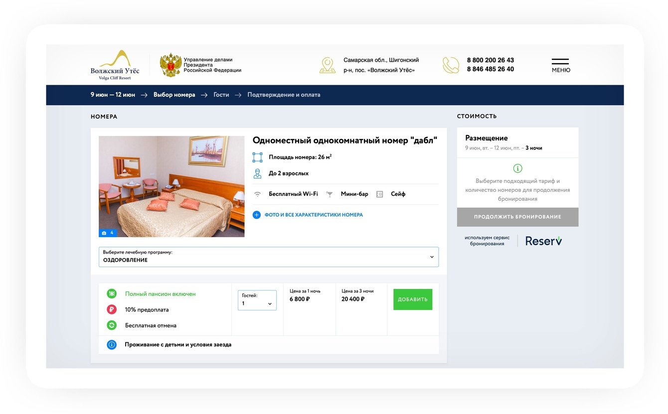 Специально переработанная версия системы бронирования Reserv.travel позволяет выбрать лечебную программу, номер, количество гостей и другие параметры. Система показывает реальное наличие номеров и динамически рассчитывает стоимость проживания. Забронировать и оплатить путевку можно также онлайн.
