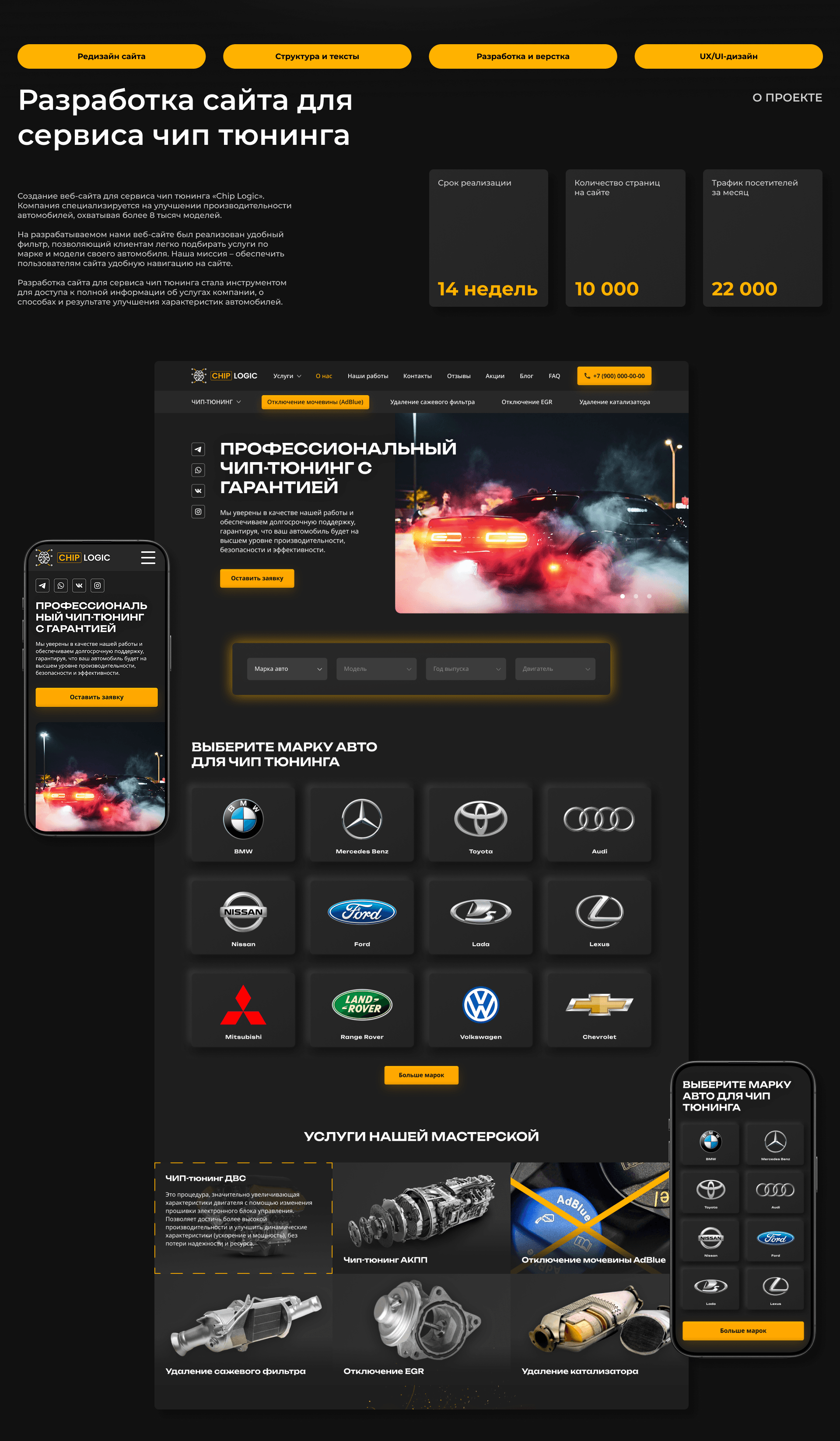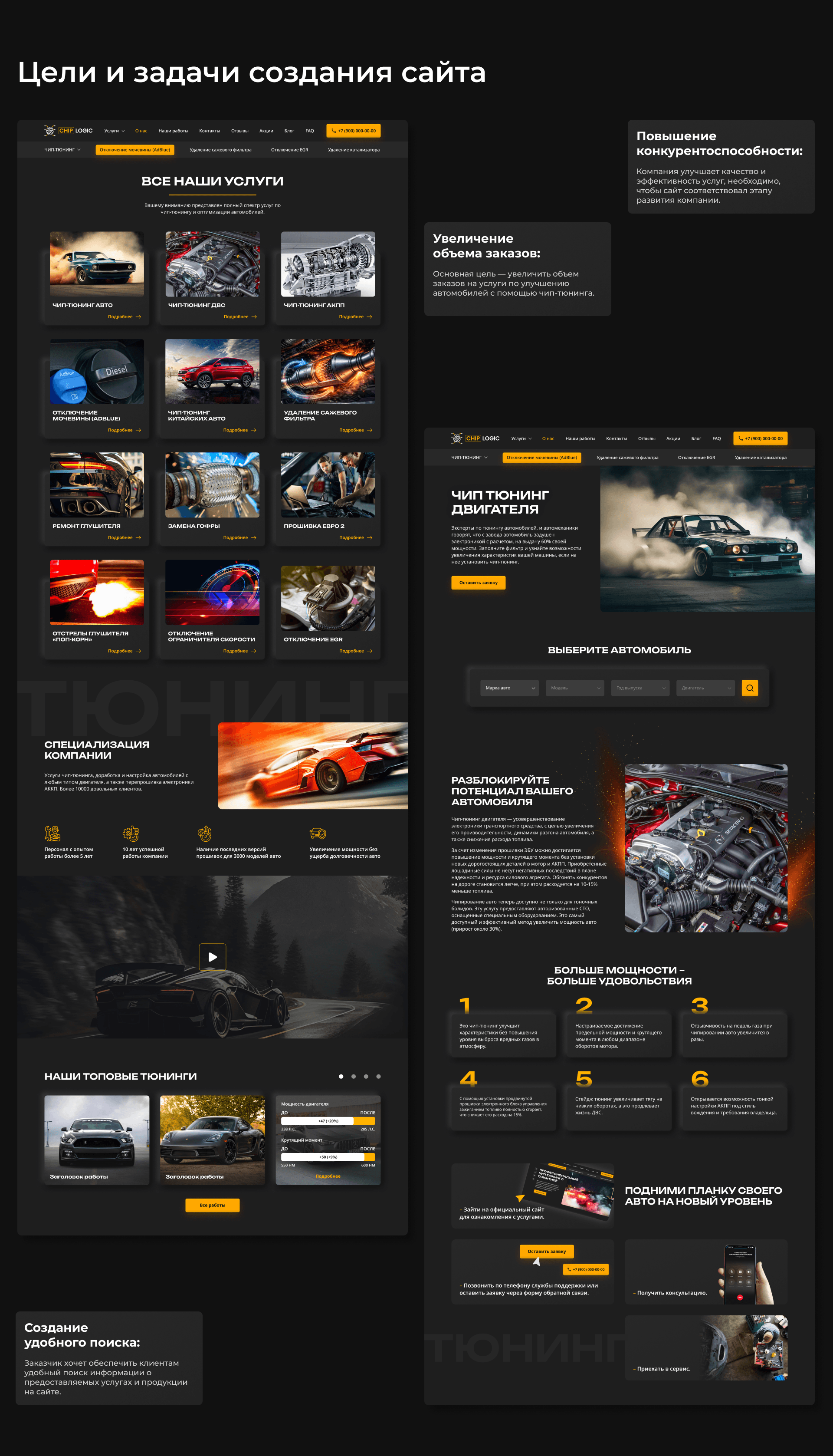 Особое внимание мы уделили структуре страниц, навигации и сценарию взаимодействия с сайтом. Для ниши чип-тюнинга это особенно важно, потому что посетитель приходит не просто «посмотреть сайт», а хочет быстро понять, подходит ли сервис под его автомобиль и может ли компания решить его задачу.