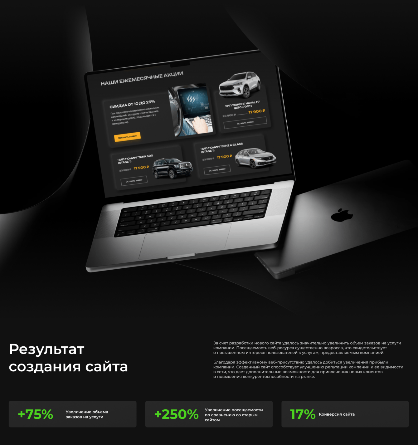 Сотрудничество с командой по созданию сайта для нашего сервиса чип-тюнинга оказалось полностью удачным. Сайт действительно привлек внимание большого числа потенциальных клиентов, что отразилось на росте объема заказов и увеличении нашей прибыли. Мы довольны результатом и профессионализмом. Команда смогла учесть все наши требования и ожидания.