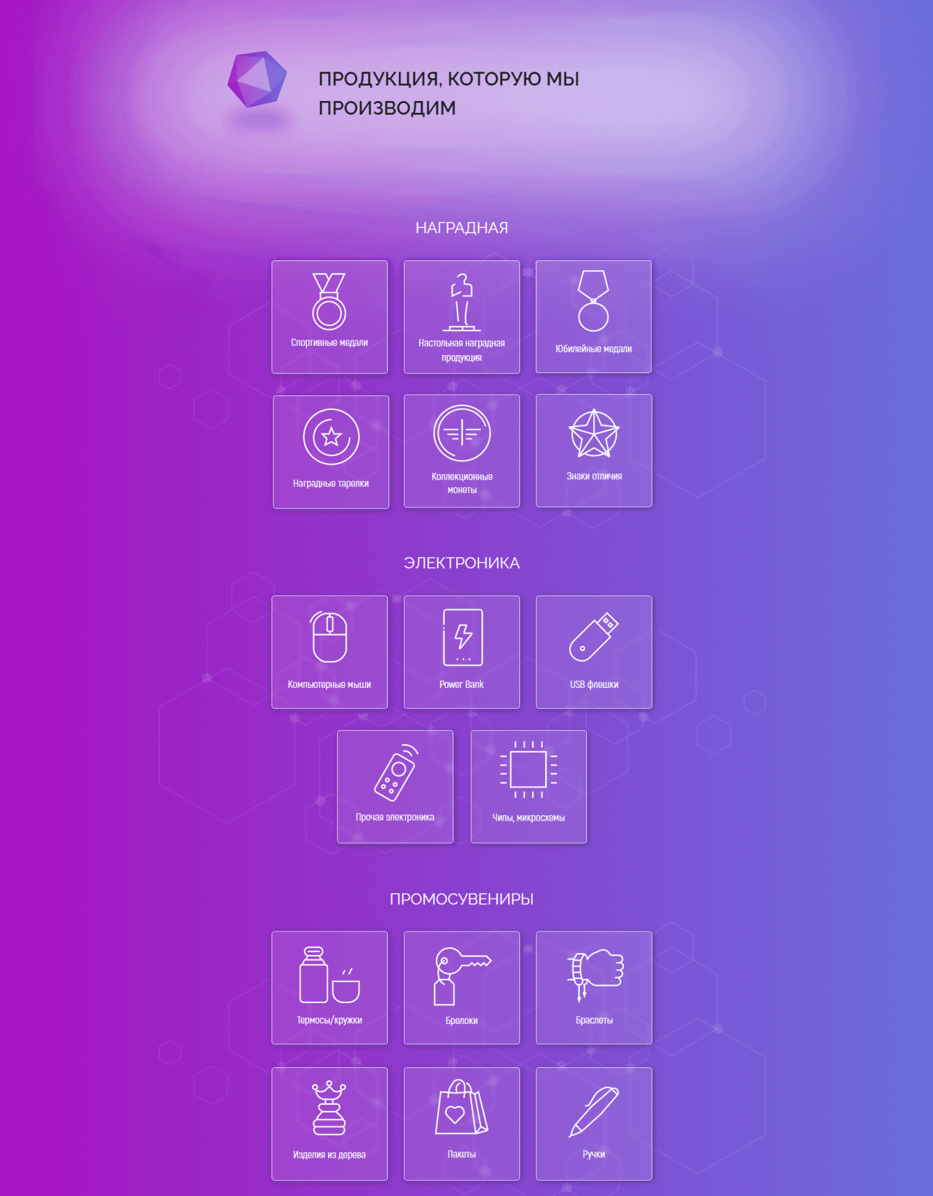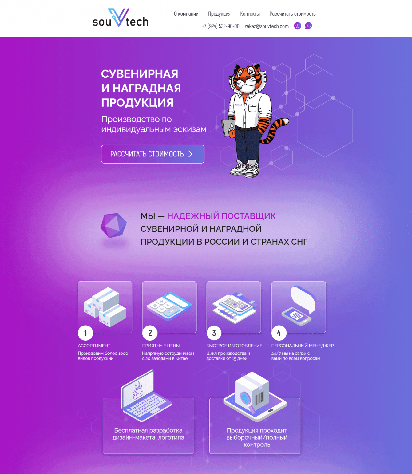 SouvTech- компания которая оказывает услуги по изготовлению сувенирной и наградной продукции. Особенность проекта в том, что компания удовлетворяет любые пожелания клиента, начиная от разработки макета.