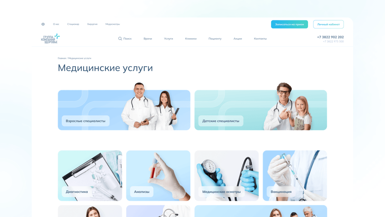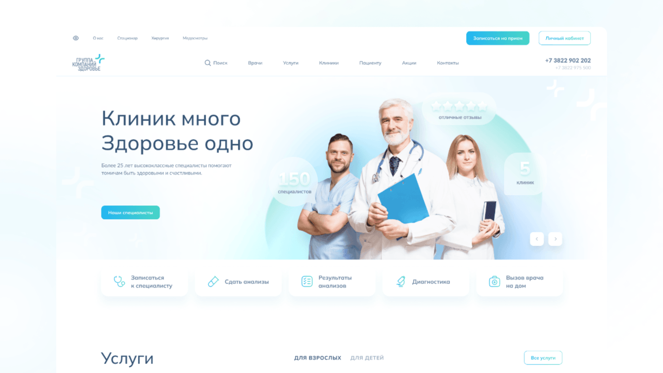 Перед нами стояла задача создать современный и функциональный веб-сайт для медицинской организации, который бы обеспечивал удобный доступ к информации и онлайн-записи для его пользователей. Сайт должен был стать эффективным инструментом как для пациентов, так и для сотрудников нескольких клиник медицинского объединения, с возможностями для быстрого получения информации о медицинских услугах, врачах и записи на прием.