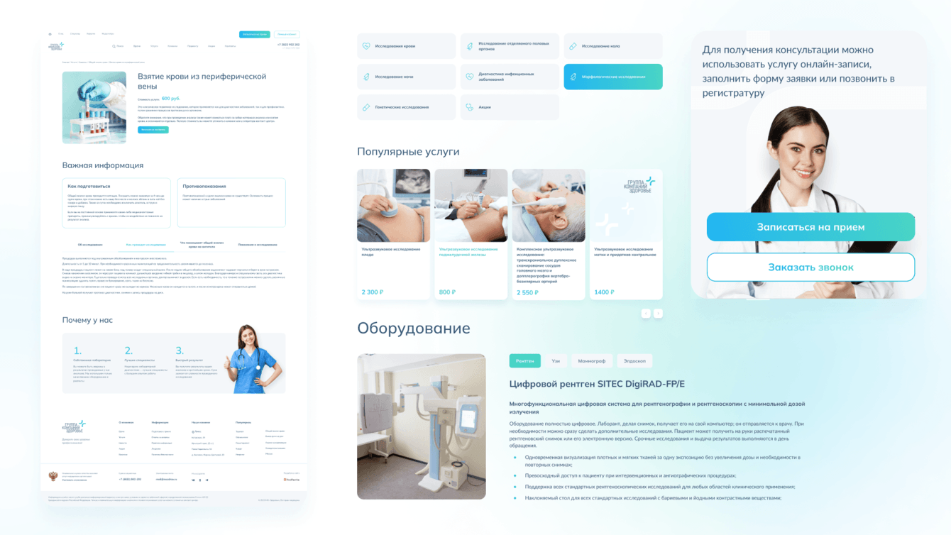 Дизайн продуман таким образом, чтобы пользователь мог быстро найти необходимое, будь то запись на прием, информация о врачах или перечень медицинских услуг, а заранее проработанные пользовательские пути помогли сделать страницу максимально удобной и функциональной. Каждый элемент на странице размещен с учетом логики пользовательского поведения, что позволяет быстро ориентироваться даже тем, кто впервые зашел на сайт.