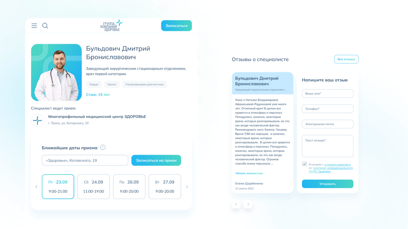 Каждый специалист представлен в отдельной карточке, где указаны его специализация, образование, стаж, достижения и перечень оказываемых услуг. Также на странице врача можно найти информацию о месте приема, свободных датах для записи и ознакомиться с отзывами пациентов. Это делает процесс выбора врача удобным и информативным, помогая пользователям принять обоснованное решение.