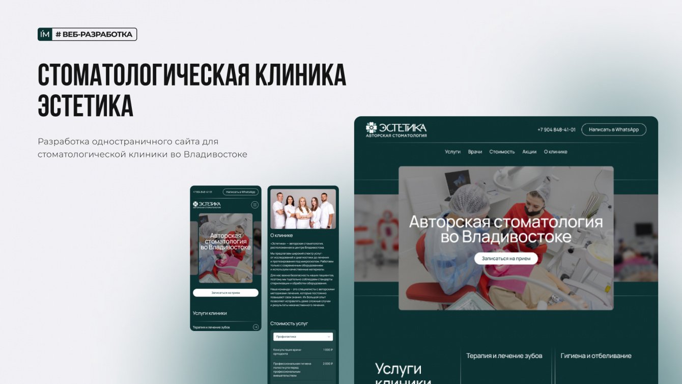 Разработка одностраничного сайта для стоматологии, отображение возможностей (услуг) и стоимости по основным направлениям работы. Подключение записи к врачам на сайте. Сайт должен был подходить под поисковое продвижение (Яндекс.Директ, SEO), что также было заложено.