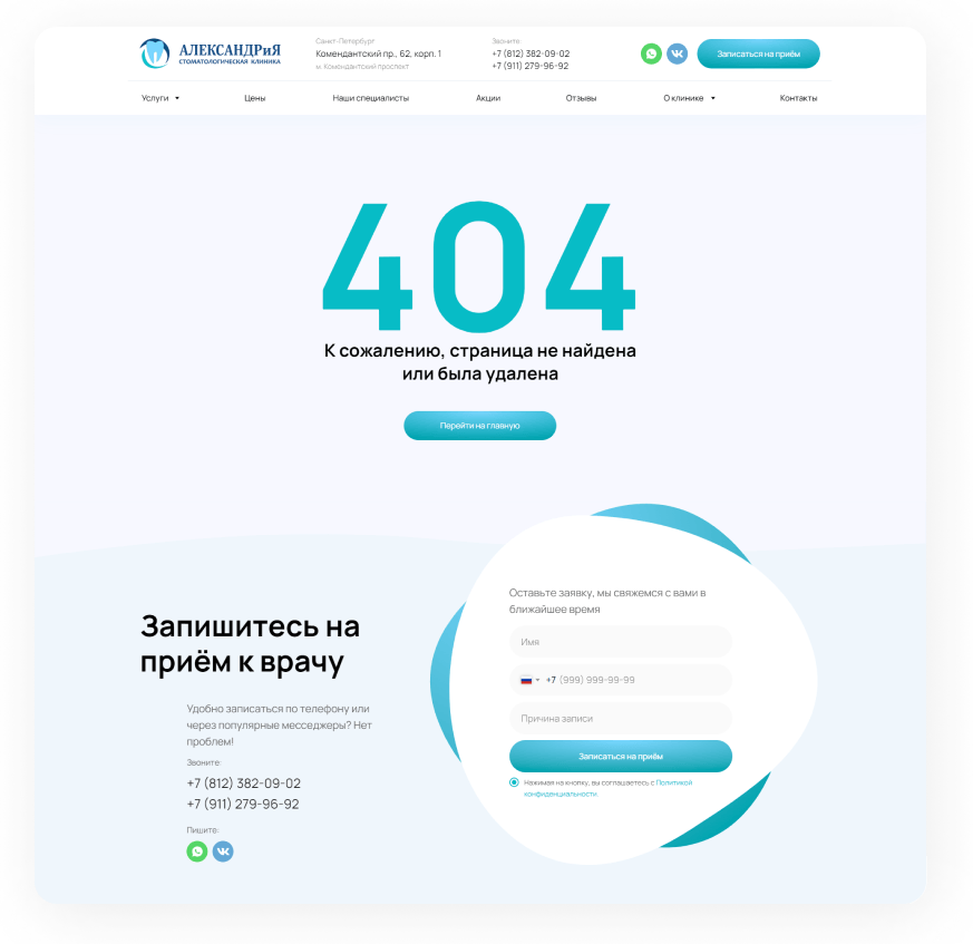 Не обошлось и без разработки страницы ошибки 404. Не забываем и здесь покреативить, дополнив визуалом под фирстиль компании. А также с нее удобно перейти в меню или на главную страницу.